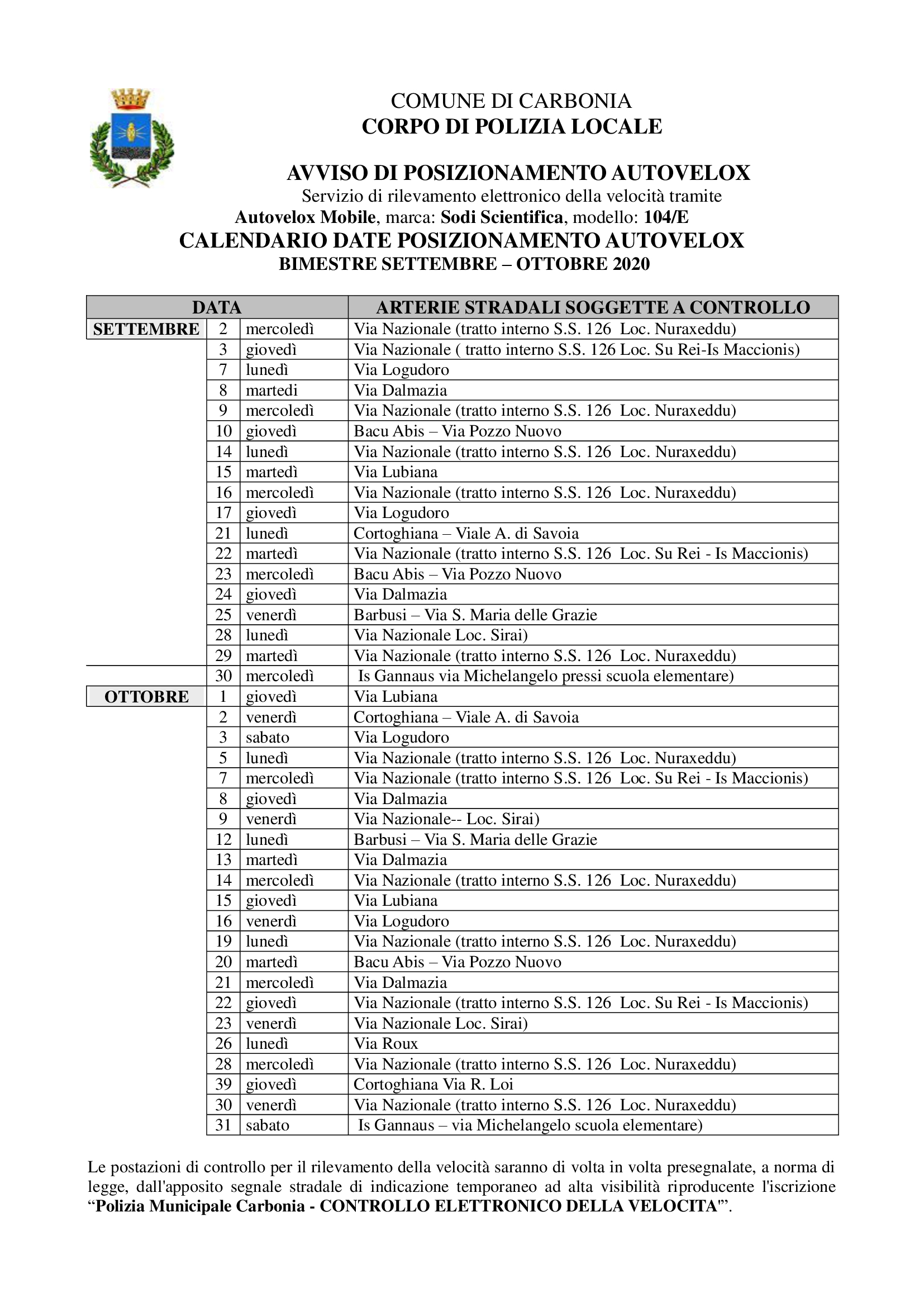 Le postazioni di controllo per il rilevamento della velocità saranno di volta in volta presegnalate, a norma di legge, dall’apposito segnale stradale di indicazione temporaneo ad alta visibilità, riproducente l’iscrizione “Polizia Municipale di Carbonia – Controllo elettronico della velocità”.