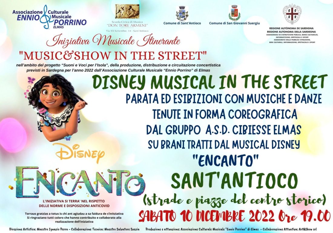 Si inizia a Sant’Antioco sabato 10 dicembre (alle 19.00) con l’iniziativa “Disney Musical in the Street” tenuta dall’A.S.D. CIBIESSE di Elmas che effettuerà una parata nelle vie e piazze del centro storico di Sant’Antioco proponendo esibizioni in forma coreografica con musiche e danze su brani tratti dal Musical Disney “ENCANTO”.