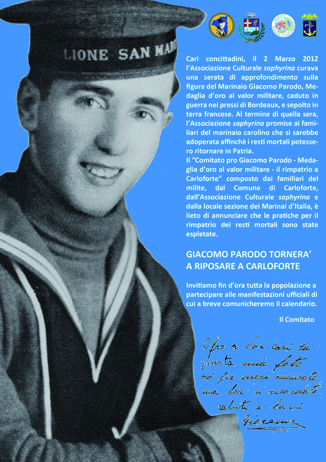 Sabato sera, giungerà a Carloforte la salma di Giacomo Parodo, un marinaio appartenente al battaglione San Marco al quale fu conferita la medaglia d’oro al valor militare. I suoi resti erano tumulati nel cimitero militare di Tolone. La cerimonia funebre si svolgerà lunedì pomeriggio, presente il vescovo di Iglesias, monsignor Giovanni Paolo Zedda, l’Ammiraglio Gualtiero Maltesi di Marisardegna, altre autorità e moltissime associazioni.