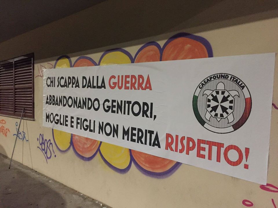 «Chi scappa dalla guerra, abbandonando genitori, moglie e figli non merita rispetto!». E’ questo il testo degli striscioni a firma CasaPound Italia spuntati questa mattina in un centinaio di città italiane, comprese Cagliari, Sassari e Carbonia.