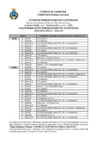 Nel sito www.comune.carbonia.ci.it, sezione Servizi comunali – Servizio Polizia Locale – Avvisi, è disponibile il calendario dei controlli sulla velocità, per i mesi di aprile e maggio 2017, che saranno effettuati tramite dispositivi mobili, comunemente noti con il nome di Autovelox.