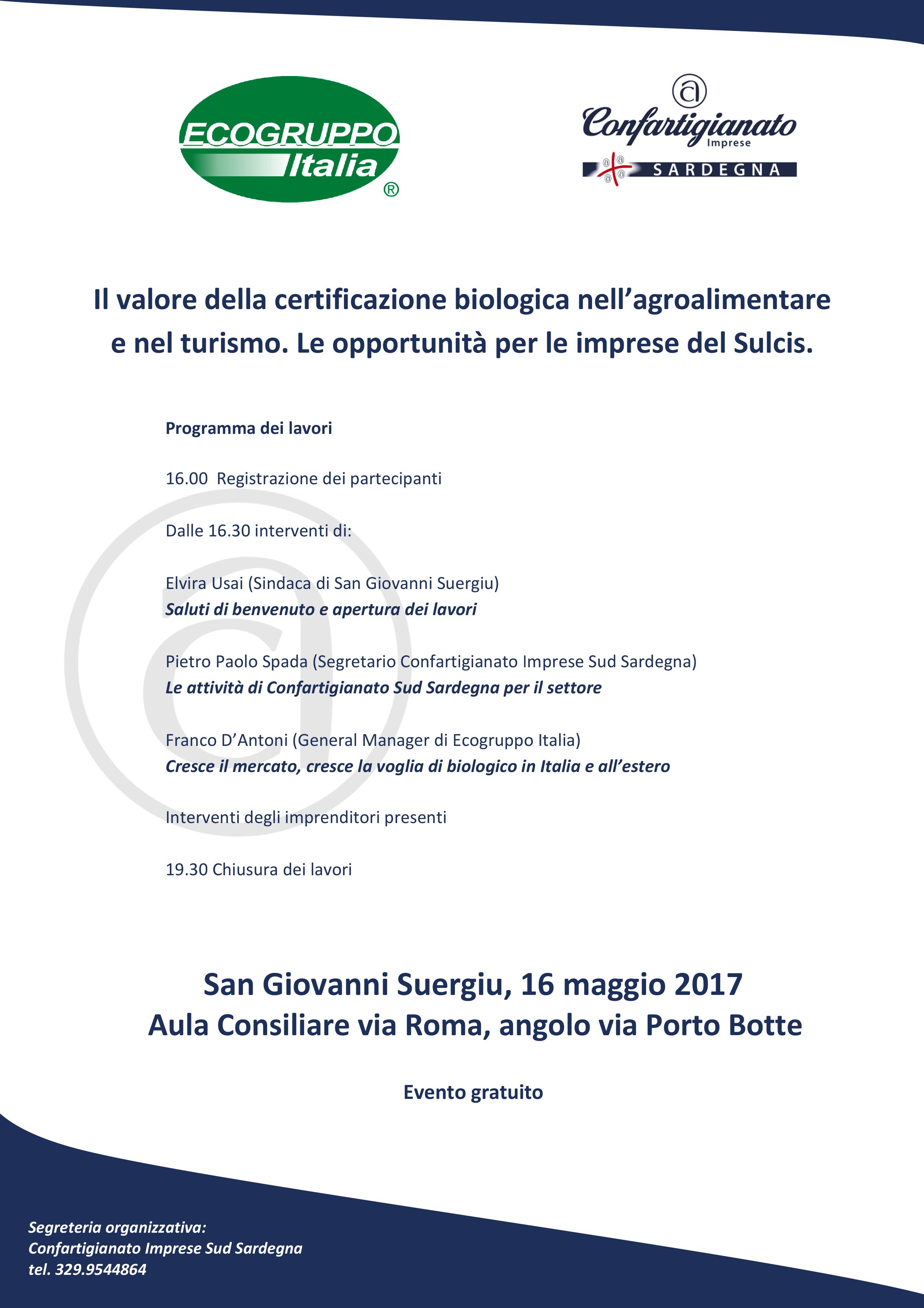 Il programma prevede, alle 16.00, la registrazione dei partecipanti poi dalle 16.30 i saluti d’apertura lavori del sindaco di San Giovanni Suergiu, Elvira Usai, seguiti dall’intervento del Segretario di Confartigianato Sud Sardegna, Pietro Paolo Spada dal titolo “Le attività di Confartigianato per il settore”, e dalla relazione del General Manager di Ecogruppo Italia, Franco D’Antoni, dal titolo “Cresce il mercato, cresce la voglia di biologico in Italia e all’estero”. Subito dopo spazio gli interventi degli imprenditori del Sulcis.