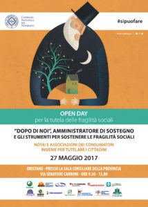 L’Open day per la tutela delle fragilità sociali, si terrà contestualmente in 61 città italiane. Nell’occasione verrà presentata la 14ª Guida per il cittadino, dedicata a “Dopo di noi, amministratore di sostegno, gli strumenti per sostenere le fragilità sociali”, realizzata dal Consiglio Nazionale del Notariato con 13 associazioni dei consumatori (Adiconsum, Adoc, Adusbef, Altroconsumo, Assoutenti, Casa del Consumatore, Cittadinanzattiva, Confconsumatori, Federconsumatori, Lega Consumatori, Movimento Consumatori, Movimento Difesa del Cittadino, Unione Nazionale Consumatori).