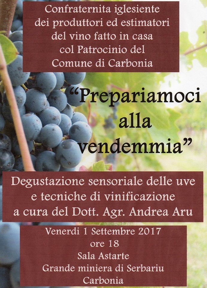 Con l’arrivo del mese di settembre, la stagione della vendemmia è ormai alle porte. Per parlare di questo tema, la Confraternita Iglesiente dei Produttori ed Estimatori del vino fatto in casa ha organizzato, con il patrocinio del comune di Carbonia, un convegno dal titolo “Prepariamoci alla vendemmia”, che si terrà venerdì 1° Settembre, alle ore 18.00, nella Sala Astarte della Grande Miniera di Serbariu.
