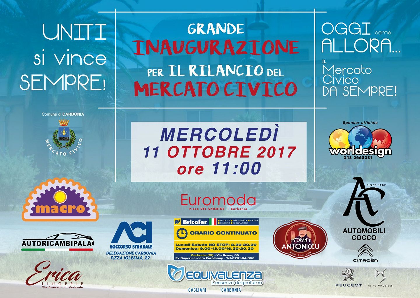 Il mercato civico di Carbonia è, da sempre, un punto di riferimento per il commercio del centro cittadino, ma, oggi più che mai, necessita di iniziative di promozione e di marketing in grado di preservare la sua funzione, soprattutto in un contesto caratterizzato dalla concorrenza della Grande distribuzione organizzata. Iniziative che, per avere successo, devono essere caratterizzate dall’unità di intenti di tutti gli esercenti del mercato civico. Ed è proprio questo il principio ispiratore che darà origine all’evento “Uniti si vince, sempre! Grande inaugurazione per il rilancio del mercato civico”. Si tratta di un’iniziativa di marketing curata dall’azienda Worldesign, con la collaborazione di numerosi imprenditori cittadini e il supporto dell’assessorato delle Attività produttive del comune di Carbonia, guidato da Mauro Manca: «ll rilancio del mercato civico è uno degli obiettivi del nostro programma di governo. Siamo entusiasti di questa iniziativa, lanciata in collaborazione tra l’Amministrazione comunale, gli operatori del mercato civico e diversi imprenditori cittadini, con l’obiettivo di far sì che questa struttura possa tornare ad essere un riferimento non solo commerciale, ma anche centro di aggregazione sociale, come lo era un tempo».
