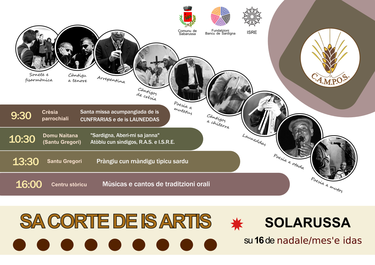 Nel pomeriggio, dalle 16.00, spazio invece alle esibizioni degli artisti nelle nove diverse aree espressive riunite da CAMPOS con gare di poesia logudoresa, a s’arrepentina, a sa moda campidanese e mutos; a chiterra; concerti per launeddas e organetto; canti a tenore e a cuncordu; canti e musiche del Natale.
