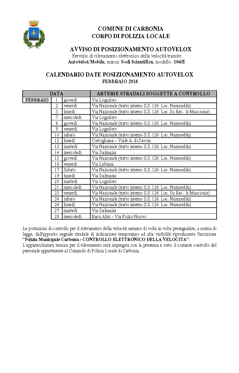 La Polizia Locale di Carbonia ha diffuso il nuovo avviso di posizionamento dell’autovelox valido per il mese di febbraio 2018.