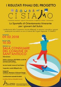 Si svolgerà venerdì 9 febbraio, dalle 10.00 alle 13.00, nella sala consiliare del comune di Sant’Antioco, l’evento conclusivo del progetto di orientamento C.I. S.I.A.M.O., organizzato dalla Cooperativa Sociale Millepiedi Onlus e dal comune di Sant’Antioco, l’evento finale del progetto di orientamento C.I. S.I.A.M.O. Consulenza Itinerante per il Supporto, Informazione, Accoglienza, Mobilità e Orientamento.