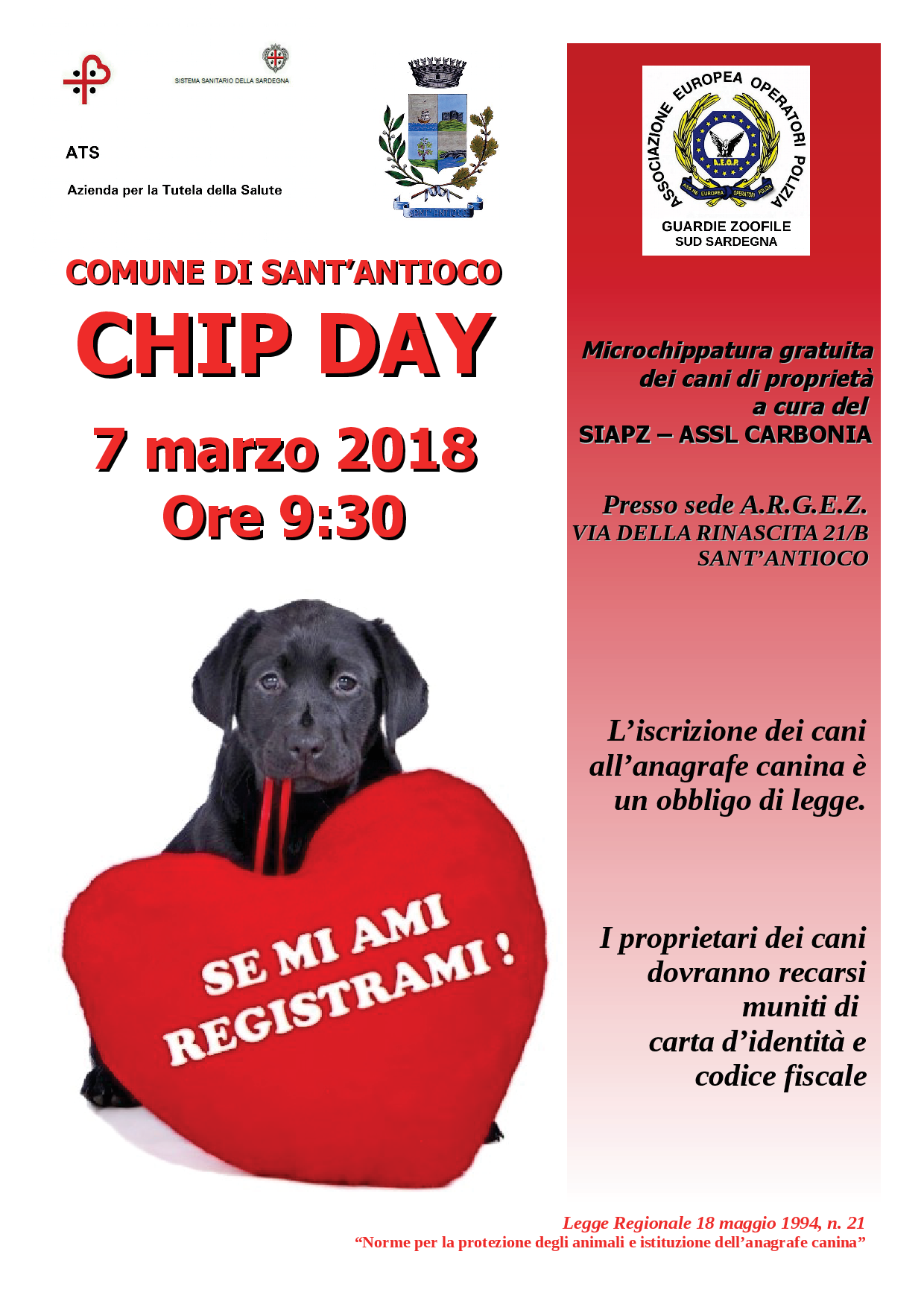 Domani, mercoledì 7 marzo, a partire dalle 9.30, a Sant’Antioco è prevista una giornata di microchippatura gratuita per i cani di proprietà. Le attività di “Chip Day” si svolgeranno presso la sede A.R.G.E.Z. di via Della Rinascita, 21/B, e sono a cura del SIAPZ (Servizio di Igiene degli Allevamenti e delle Produzioni Zootecniche) ASSL Carbonia, in collaborazione con l’Associazione Europea Operatori Polizia – Guardie Zoofile Sud Sardegna e il comune di Sant’Antioco. I proprietari dei cani che vorranno usufruire del servizio dovranno recarsi presso la sede A.R.G.E.Z. muniti di carta di identità e codice fiscale. L’iscrizione dei cani all’anagrafe canina è un obbligo di legge.