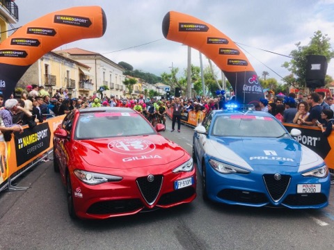 Due speciali Alfa Romeo Giulia al traguardo del Giro d’Italia 2018.