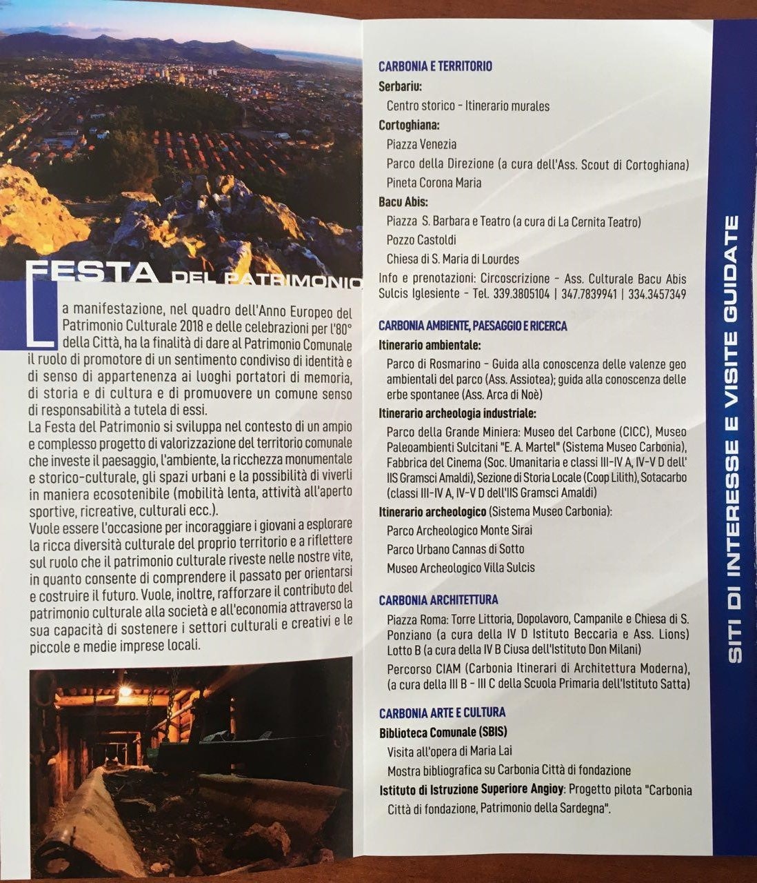 Due giorni di festa per valorizzare il grande patrimonio culturale, sportivo, ambientale, paesaggistico, musicale ed artistico della nostra città. È questo il tratto che caratterizza la prima edizione della “Festa del Patrimonio”, organizzata dal comune di Carbonia per il weekend di sabato 19 e domenica 20 maggio.