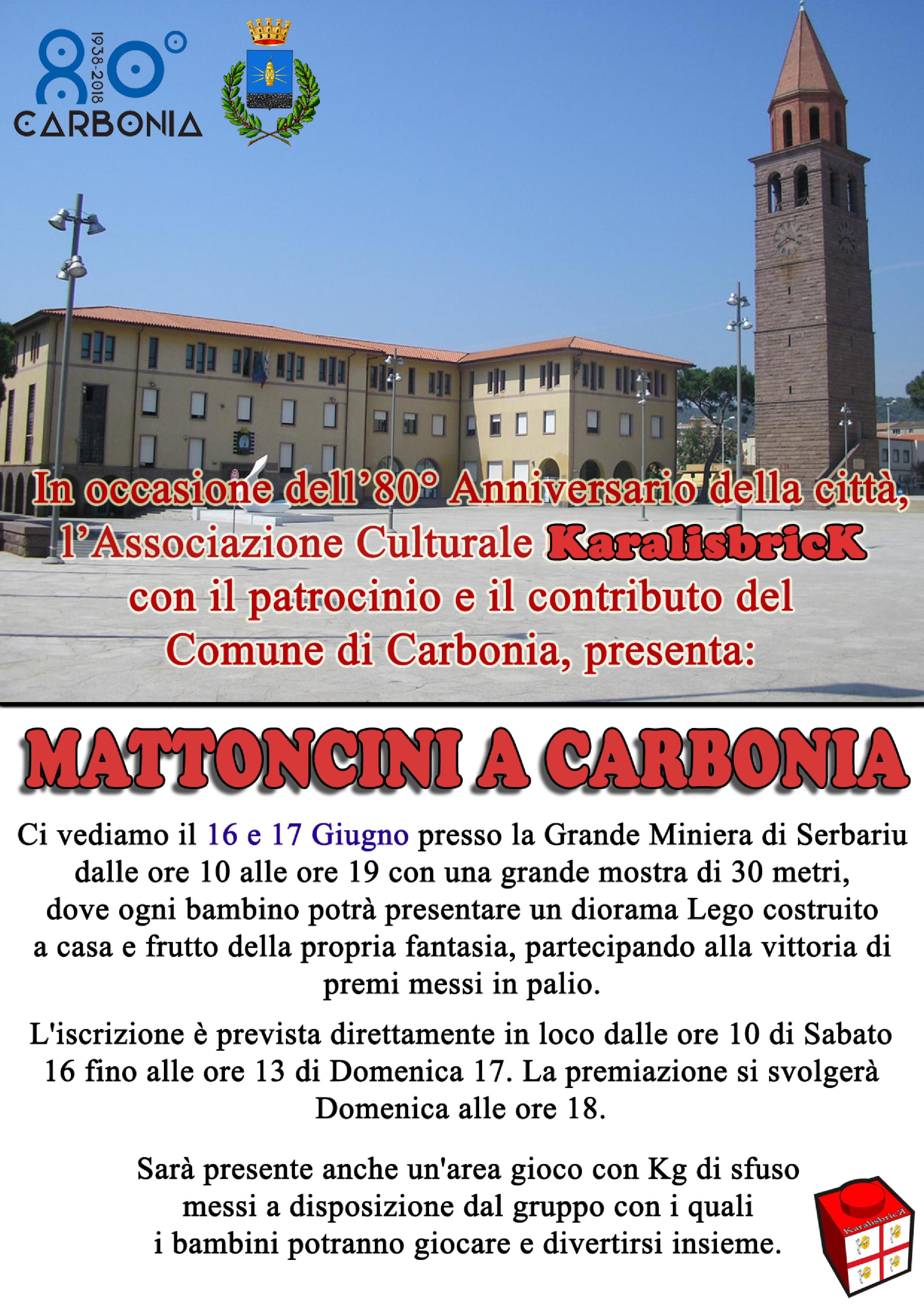 L’evento, intitolato “Mattoncini a Carbonia”, fa parte delle celebrazioni previste in occasione dell’80° anniversario della città di Carbonia, ed è stato organizzato dall’associazione culturale Karalisbrick con il patrocinio ed il contributo del comune di Carbonia.