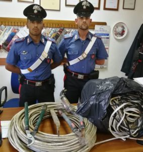 Nella perquisizione personale e dell’autovettura in uso, sono state rinvenute tre troncatrici, diversi guanti da lavoro e cinque grossi cacciavite, mentre a casa di S.R.H sono stati trovati tre bustoni di guaina per cavi elettrici, alla quale era stato sottratto il cavo in rame.