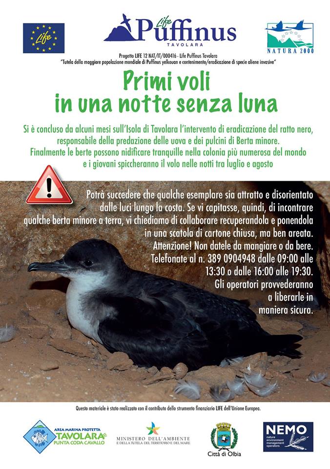 Comune di Olbia e Area marina protetta di Tavolara – Punta Coda Cavallo lanciano un appello per sensibilizzare la popolazione al recupero dei piccoli esemplari di berta minore che finiscano il proprio volo al suolo, disorientati e disturbati dalle luci. Si è concluso da alcuni mesi sull’isola di Tavolara l’intervento di eradicazione del ratto nero, responsabile della predazione delle uova e dei pulcini di berta minore, nell’ambito del progetto Life Puffinus Tavolara del Comune di Olbia. Le berte nidificano a Tavolara, nella colonia più numerosa al mondo e i giovani uccelli spiccano il volo nelle notti tra luglio ed agosto. Può quindi accadere che i giovani volatili siano disorientati o attratti dalle luci lungo la costa, concludendo il loro volo a terra e non nei luoghi di nidificazione. In questo habitat inconsueto sono esposti ai pericoli. Per questo i responsabili del progetto hanno deciso di lanciare un appello rivolto a chiunque si imbattesse in qualche esemplare di questa specie protetta che si trovi a terra.