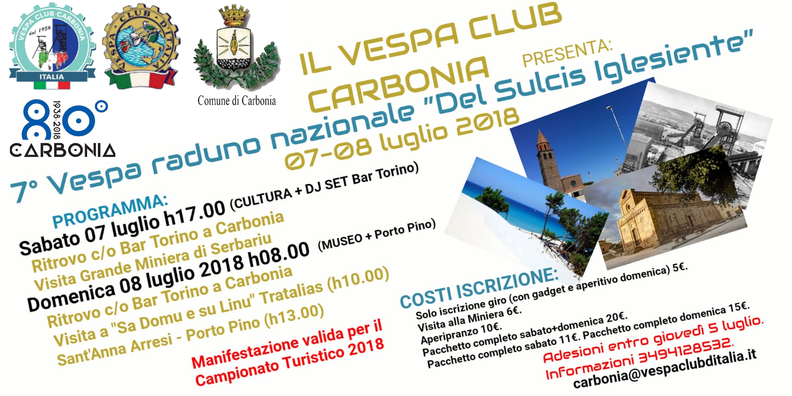 Sabato 7 e domenica 8 luglio Carbonia ospiterà il 7° Raduno Vespa nazionale del Sulcis Iglesiente, organizzato dal Vespa Club Carbonia e dal Bar Torino di piazza Ciusa, con il patrocinio del comune di Carbonia.