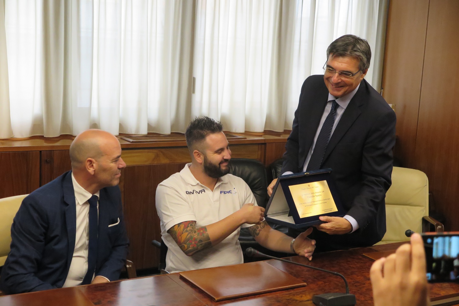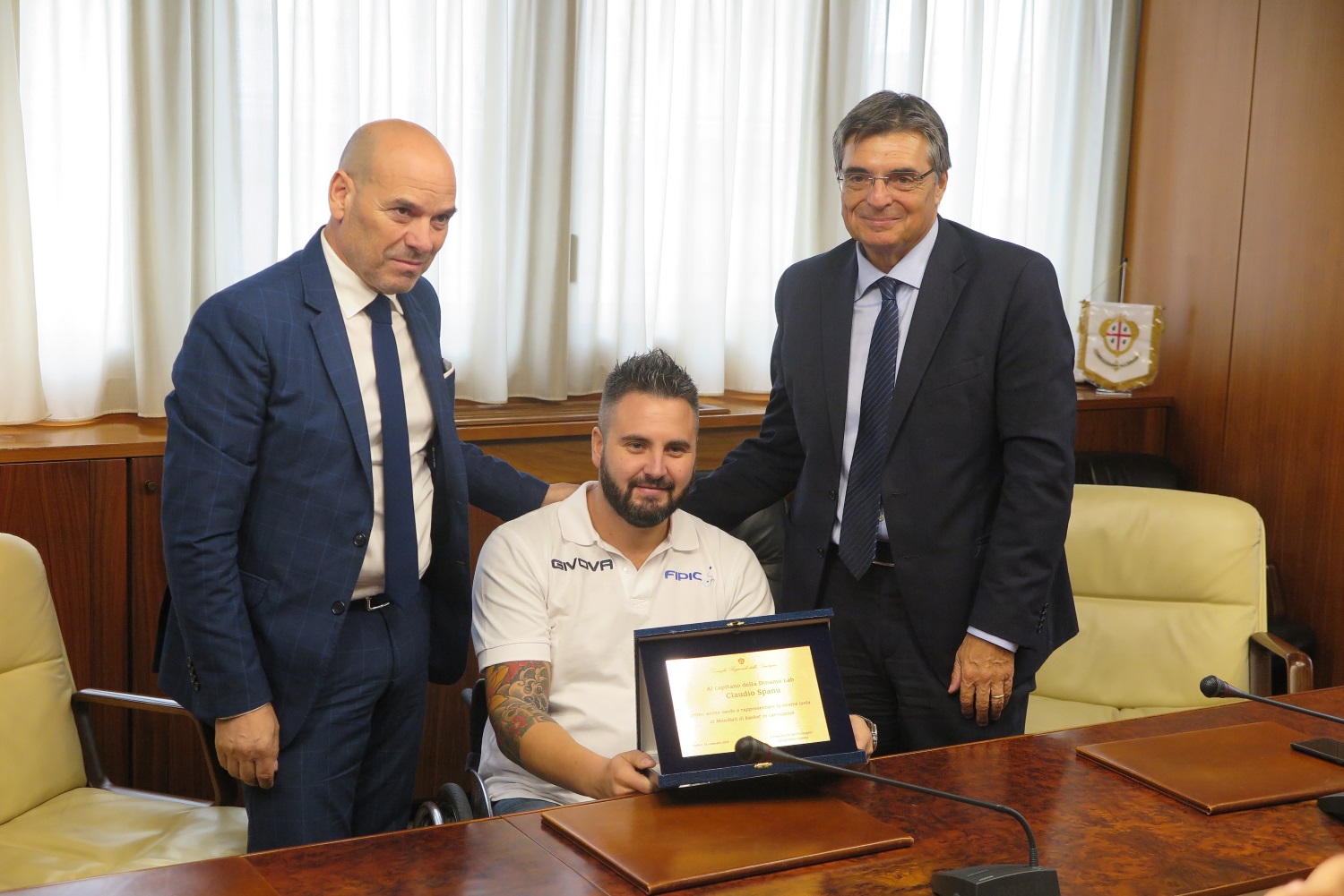 Il presidente del Consiglio regionale Gianfranco Ganau ed il vice Antonello Peru hanno consegnato una targa-premio all’atleta di Sorso Claudio Spanu, giocatore della Dinamo Lab di Sassari, di cui è anche capitano, e della Nazionale italiana di basket in carrozzina.