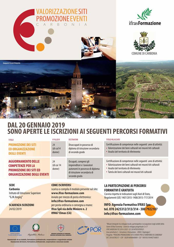 Sono aperte le iscrizioni per partecipare ai percorsi formativi gratuiti organizzati dall’agenzia IFRAS SpA, dal titolo: “Percorsi di promozione di siti ed eventi per il territorio di Carbonia”.