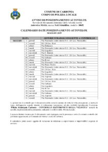 Il calendario delle postazioni autovelox disposte dal comune di Carbonia per il mese di maggio 2019.