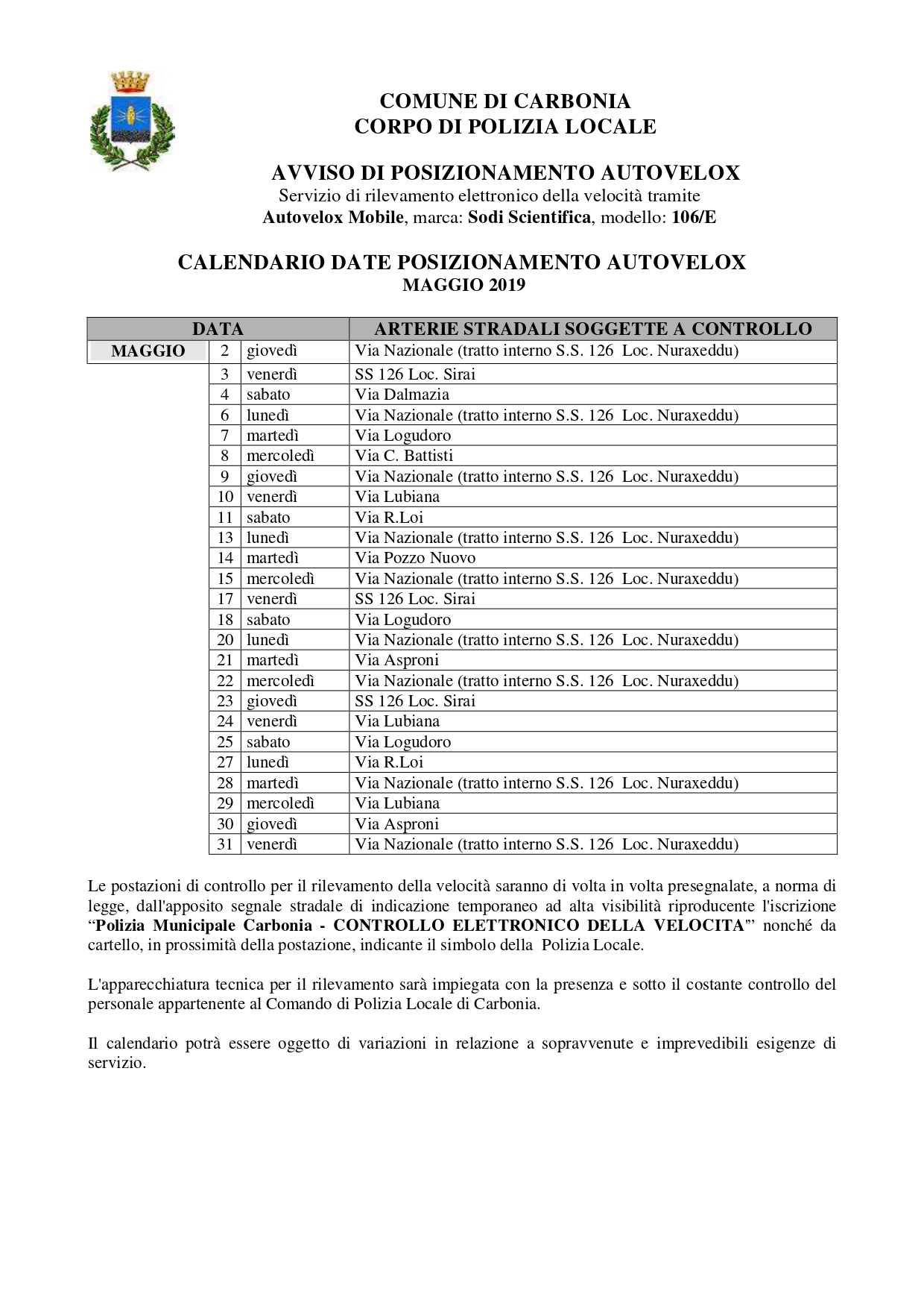 La Polizia locale del comune di Carbonia effettuerà nel corso del mese di maggio 2019 controlli sistematici su tutto il territorio comunale per verificare che siano rispettati i limiti di velocità da parte dei conducenti.