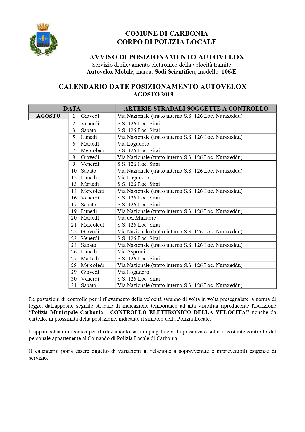 La Polizia Locale del comune di Carbonia effettuerà nel corso del mese di agosto 2019 controlli sistematici su tutto il territorio comunale per verificare che siano rispettati i limiti di velocità da parte dei conducenti.