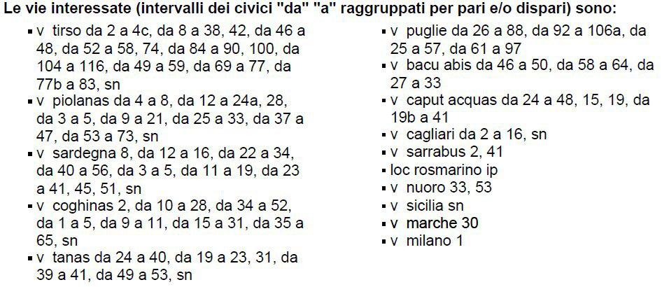 L’elenco completo delle vie e dei numeri civici soggetti a interruzione dell’erogazione elettrica è riportato nel file allegato.