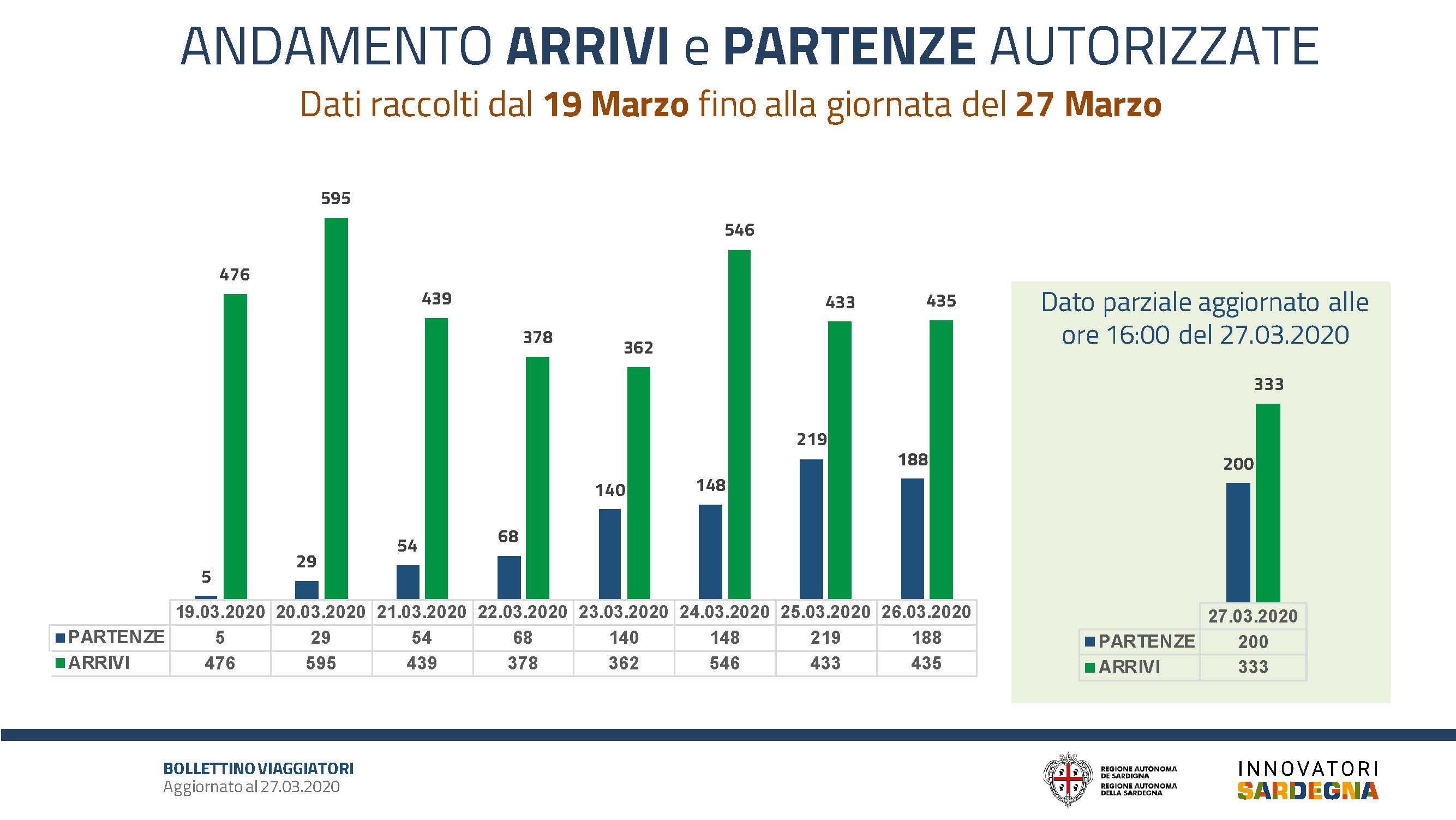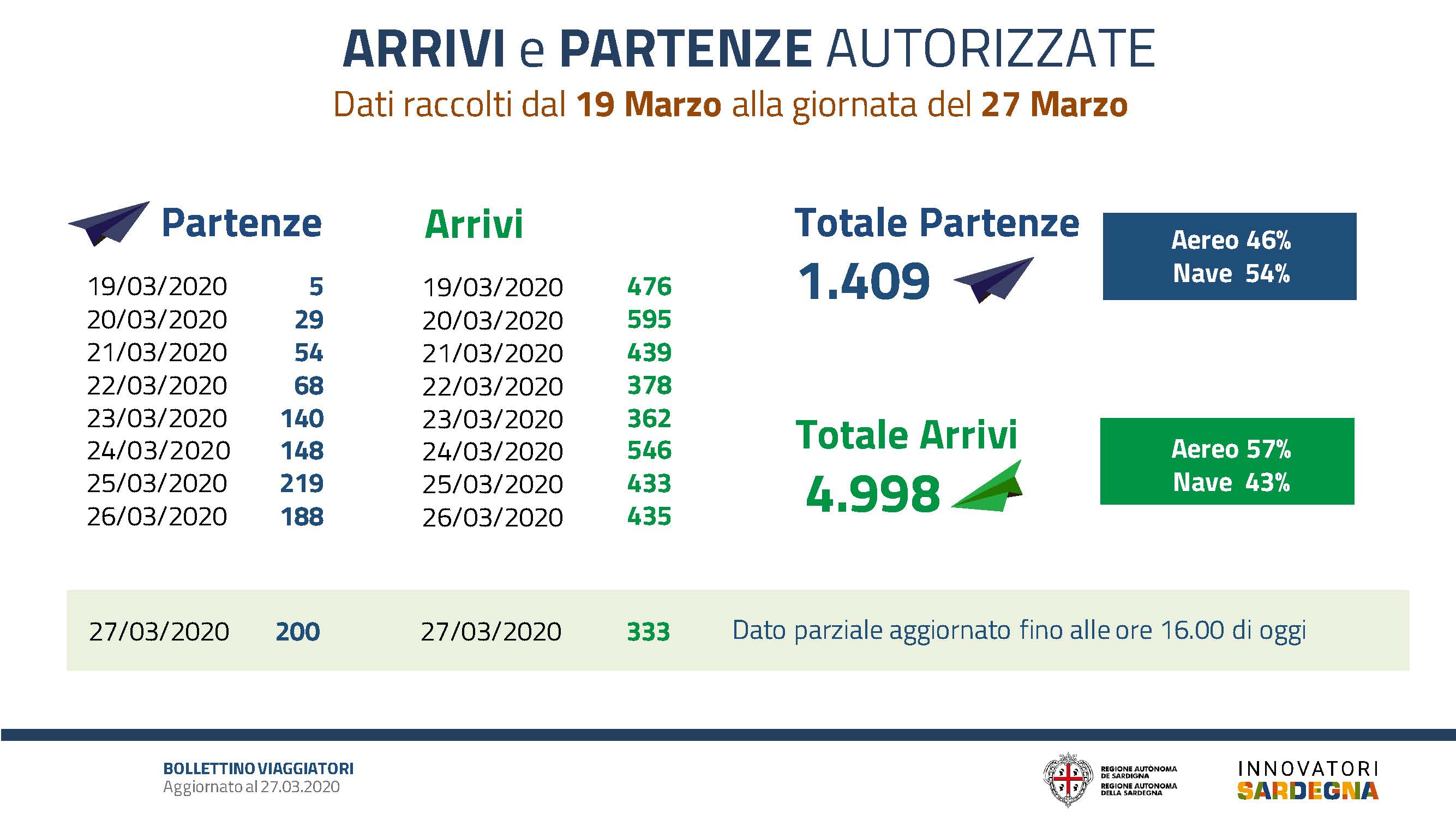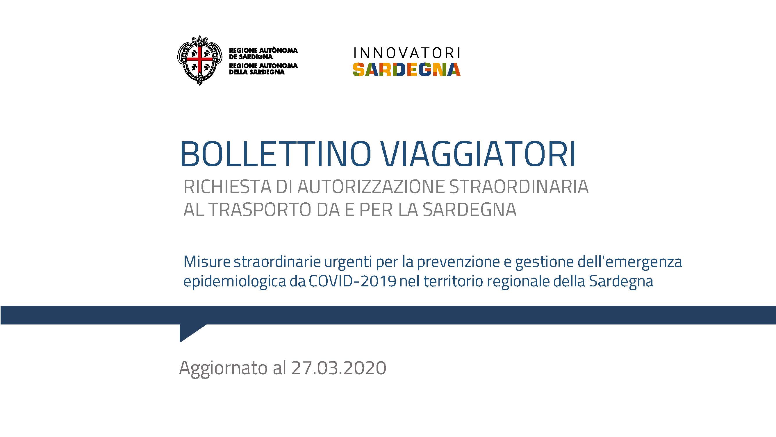 Il bollettino viaggiatori pubblicato stasera dalla Regione, contenente la richiesta di autorizzazione straordinaria al trasporto da e per la Sardegna, misure straordinarie urgenti per la prevenzione e gestione dell’emergenza epidemiologica da Covid-2019 nel territorio regionale della Sardegna.