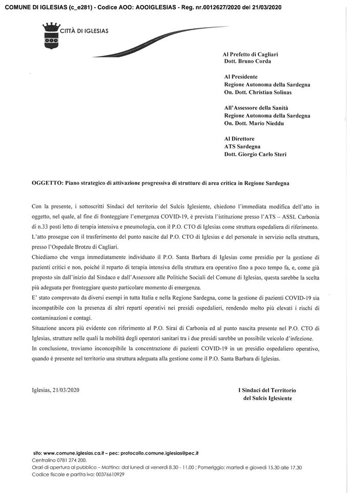 «Al fine di fronteggiare l’emergenza connessa al diffondersi del Covid-19 (Coronavirus), l’Azienda per la Tutela della Salute della Sardegna (ATS) ha previsto l’istituzione di n. 33 posti letto di terapia intensiva presso il CTO di Iglesias – ha scritto Andrea Pisanu -. Questo provvedimento prevede però il TRASFERIMENTO del punto nascite dal CTO di Iglesias con il personale in servizio nella struttura all’Ospedale Brotzu di Cagliari. Tale scelta si palesa totalmente incomprensibile (per essere educati), in quanto ad Iglesias esiste l’Ospedale Santa Barbara che fino a poco tempo fa ospitava reparti ospedalieri. Il nuovo reparto di terapia intensiva potrebbe, pertanto, essere costituito presso il San Barbara con notevole risparmio di tempi e di costi. Inoltre, evitando la mobilità dei dipendenti verso Cagliari, si ridurrebbero anche le possibilità di contagio per personale medico ed infermieristico, già troppo esposto al virus.»