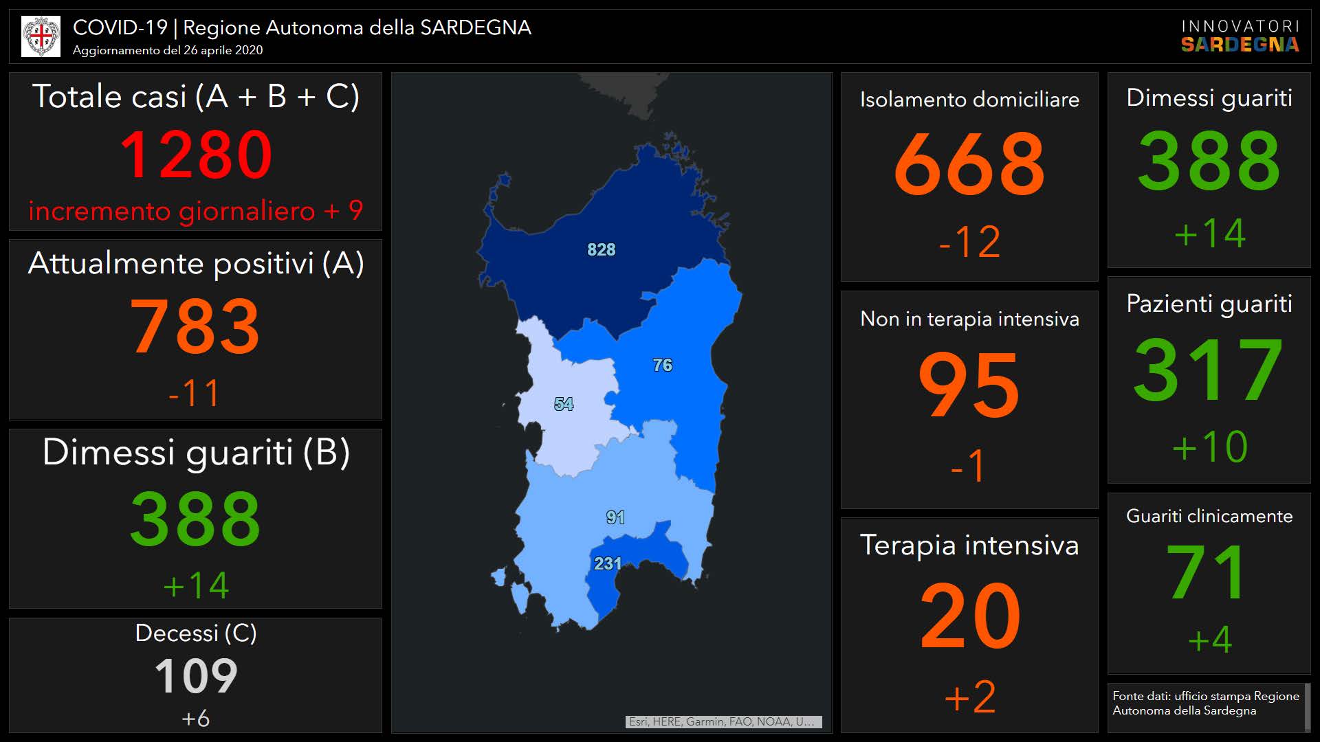 La situazione sanitaria in Sardegna continua a evolvere nella direzione auspicata e si avvicina l’avvio della “Fase 2”. 6 dei 9 nuovi casi positivi sono stati riscontrati nella provincia di Sassari, i 2/3, in media con il dato complessivo che vede la provincia di Sassari arrivata ad un numero complessivo di 828 su 1.280, il 64,69%. 2 casi sono stati riscontrati nella provincia di Oristano (il totale è salito a 54) e 1 nella Città Metropolitana di Cagliari (il totale è ora di 231). Nessun nuovo caso positivo nella provincia di Nuoro (totale 76) e nella provincia del Sud Sardegna (totale 91).