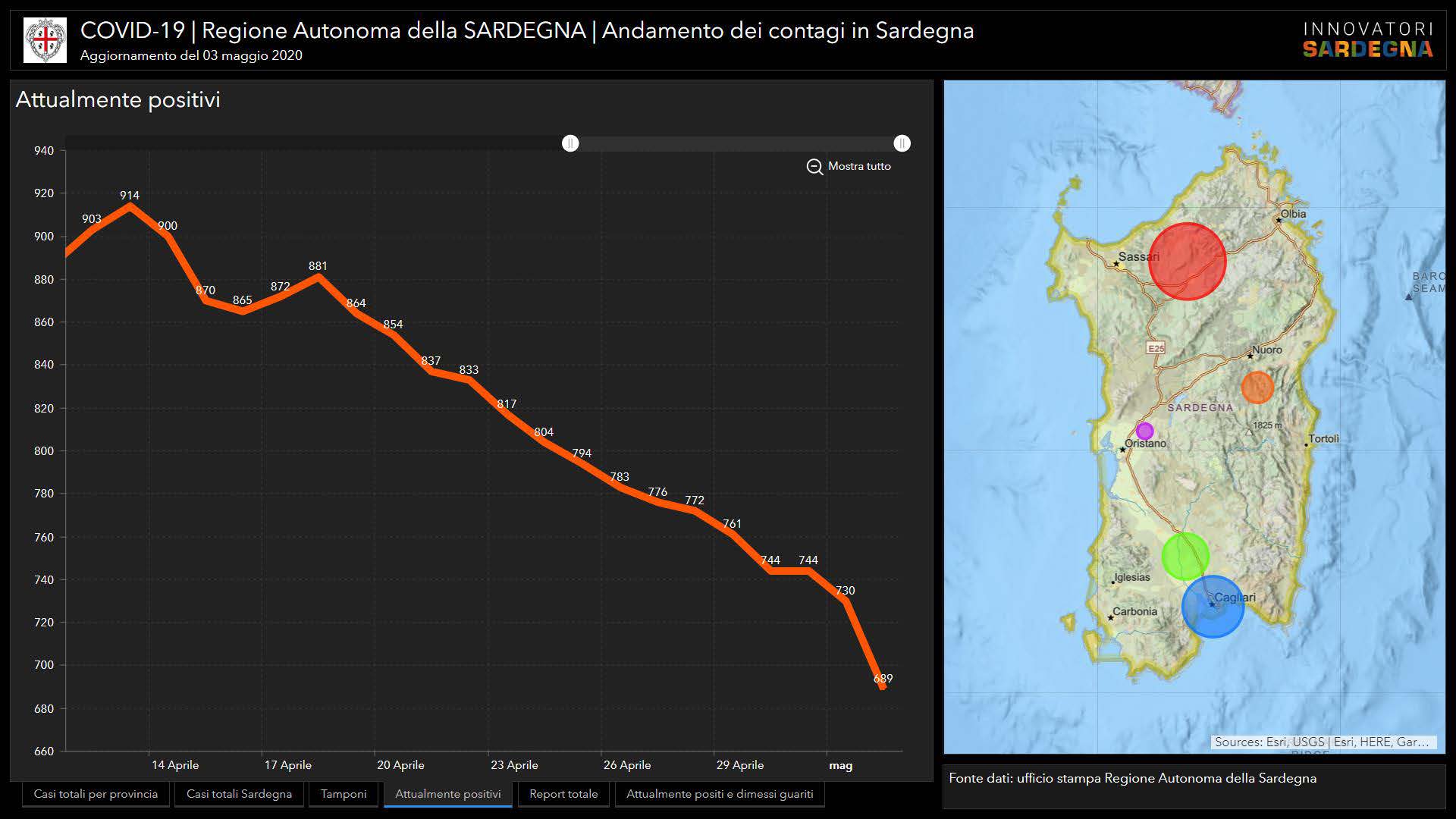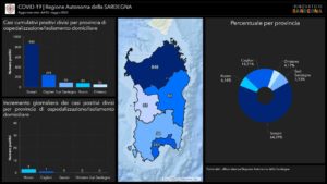 Sul territorio, dei 1.319 casi positivi complessivamente accertati, 241 sono stati registrati nella Città Metropolitana di Cagliari (+1 rispetto all’ultimo aggiornamento), 94 nel Sud Sardegna, 55 a Oristano, 81 (+3) a Nuoro, 848 a Sassari.