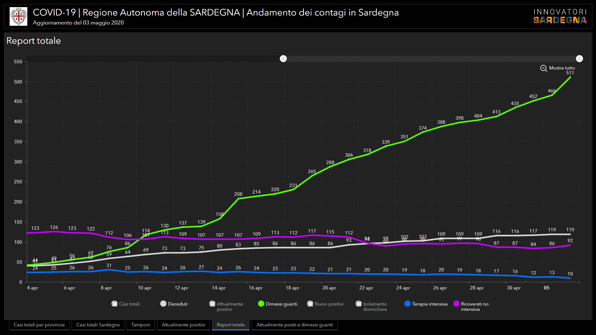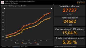 Il numero totale di casi di positività accertati in Sardegna dall’inizio dell’emergenza sale così a 1.319. È quanto rilevato dall’Unità di crisi regionale nell’ultimo aggiornamento. In totale nell’Isola sono stati eseguiti 27.737 test. I pazienti ricoverati in ospedale sono in tutto 102, 92 ricoverati con sintomi, 10 in terapia intensiva, mentre 587 sono le persone in isolamento domiciliare. Il dato progressivo dei casi positivi comprende 416 pazienti guariti (+37 rispetto al dato precedente), più altri 95 guariti clinicamente. Gli attualmente positivi sono 689. Resta invariato il numero delle vittime (119).
