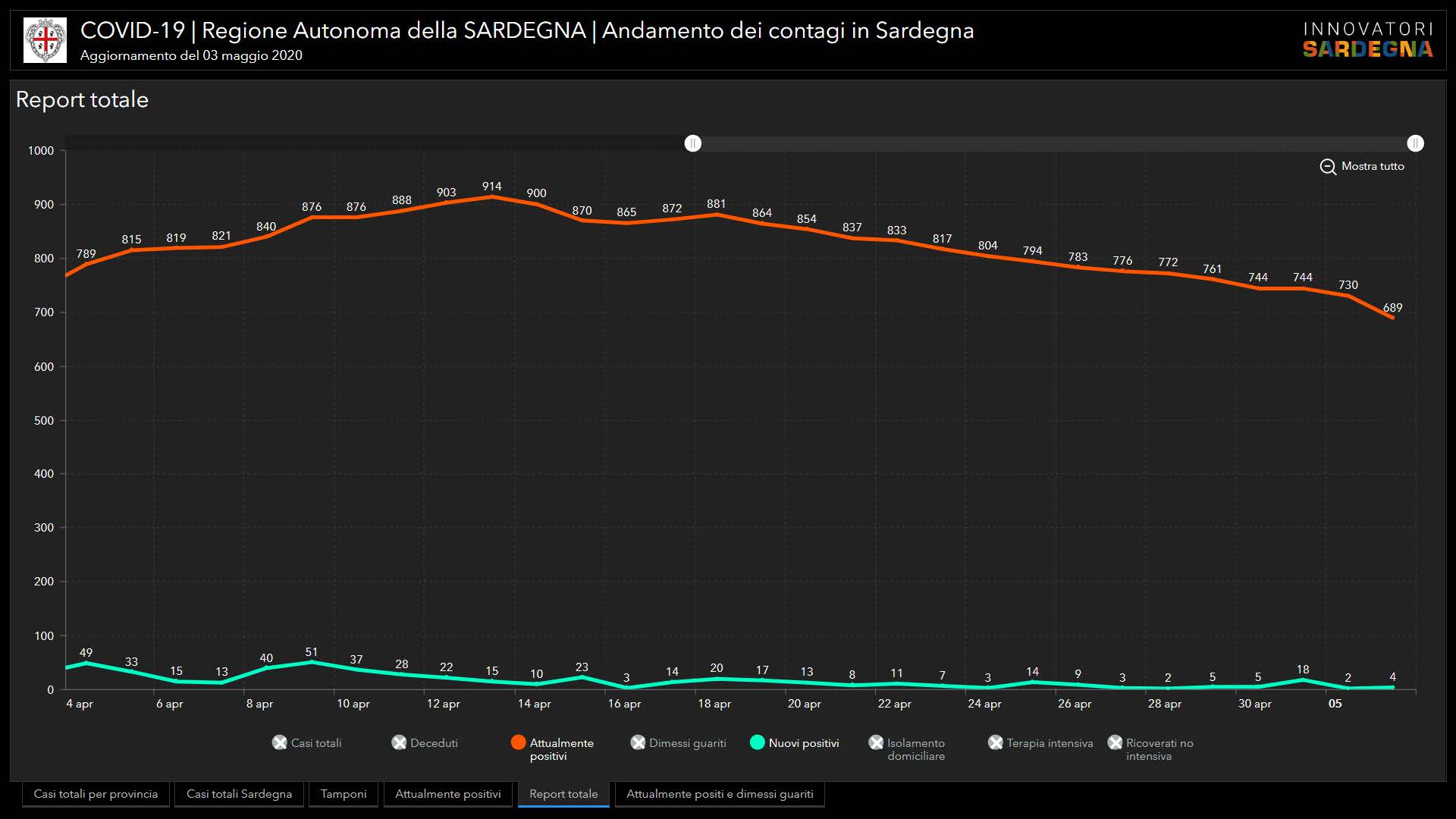 Sono 4 i nuovi casi positivi al Covid-19 riscontrati oggi in Sardegna, su 747 tamponi eseguiti. Nessun decesso
