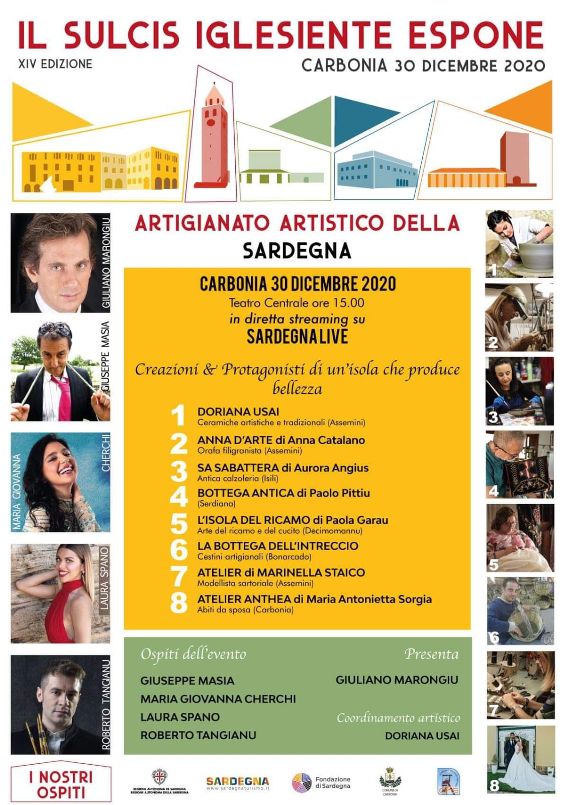 L’evento, con il patrocino della RAS Sardegna, della Fondazione Sardegna e del comune di Carbonia, sarà così strutturato: – gli artigiani, in rappresentanza dei diversi settori tradizionali della Sardegna che operano nel campo della ceramica, della tessitura, della filigrana, della cestineria, dell’intaglio, del ferro, del tessuto, esporranno le loro creazioni sul palco del teatro. ll progetto ha carattere regionale e, pertanto, per la scelta degli artigiani si terrà conto anche della rappresentatività geografica e delle diverse specialità di cui saranno portatori: ad esempio, Assemini per la ceramica, Sinnai per la cestineria, Nuoro per la pelletteria, Sassari per i tessuti e via dicendo. – nel corso dello spettacolo, saranno presentati i contenuti e messi in evidenza gli aspetti legati alla storia ed alla cultura dei diversi settori tradizionali in rassegna e dei protagonisti. – l’evento sarà arricchito dall’esibizione di artisti che animeranno lo spazio dedicato all’esposizione con varietà, canzoni ed intrattenimento e si avvarrà della partecipazione di ospiti di fama regionale (tra i più richiesti del momento), creando un connubio vincente tra diverse forme espressive ed il risultato efficace che può generare la sinergia delle arti. Lo spazio scenico sarà allestito con cura e le immagini proiettate su grandi schermi led che coloreranno l’intero spettacolo. – la conduzione dell’evento sarà affidata a Giuliano Marongiu, un professionista affermato dello spettacolo, con provata esperienza, conoscenza degli argomenti e del mezzo televisivo, capace di legare i fili del racconto ed approfondire con ritmo ed eleganza i contenuti dell’arte e dell’artigianato, della tradizione e dello spettacolo.
