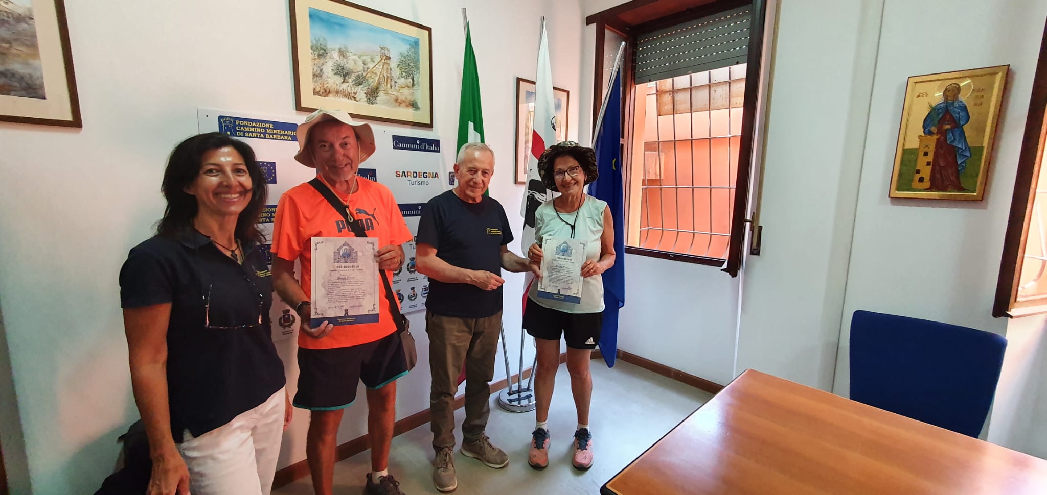 Mentre Marilena Manenti, Angelo Raimondi ed Ermanno Bottarelli di Bergamo, che hanno completato l’intero Cammino Minerario di Santa Barbara dopo aver percorso i loro primi 250 km nell’ottobre del 2019, insieme a Franco Terebinto di Roma che ha percorso invece il suo Cammino in solitaria, sono stati premiati oggi sempre nella sede della Fondazione Cammino Minerario di Santa Barbara.