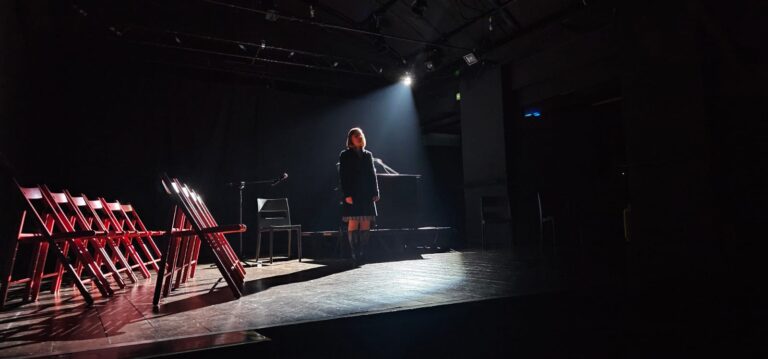 Altri suoni e altre atmosfere nel secondo atto della serata: in programma “Contrattempi”, uno spettacolo che vede due attori, Laura Fortuna e Daniel Dwerryhouse, duellare in scena attraverso alcuni tra i brani più brillanti del repertorio di Achille Campanile; un duello scandito e accompagnato dalle musiche in scena di Mauro Palmas ai plettri, affiancato da Silvano Lobina al basso e Marco Argiolas al sax e al clarinetto; un duello fatto di inversioni, parodie, capovolgimenti, ripetizioni, audaci giochi dialettici, pantomime e assurdità, situazioni surreali e continui equivoci che generano quella comicità irresistibile tipica del geniale scrittore e drammaturgo romano, che ha saputo raccontare con leggerezza e umorismo la società e la condizione umana. La scena rimane sempre al centro dell’azione, anche con il camerino in bella vista, permettendo cambi d’abito, trucchi e pause sotto gli occhi del pubblico. I fantasmi di un teatro dal sapore un po’ retrò contribuiscono a interpretare il presente e a interrogarci sulla follia delle relazioni umane e di coppia, senza dimenticarci di riderci su. Perché ridere è rivoluzionario.