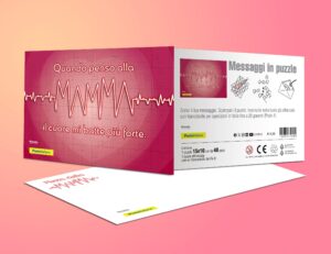 Una cartolina è in formato standard mentre l’altra cartolina, dal titolo “Quando penso alla mamma il cuore mi batte più forte”, è stata realizzata come un vero e proprio puzzle che consente di scrivere un testo, dividere la cartolina in singole tessere e spedire il tutto in una busta già affrancata. La destinataria dovrà ricomporre il puzzle e scoprire così il messaggio di auguri.