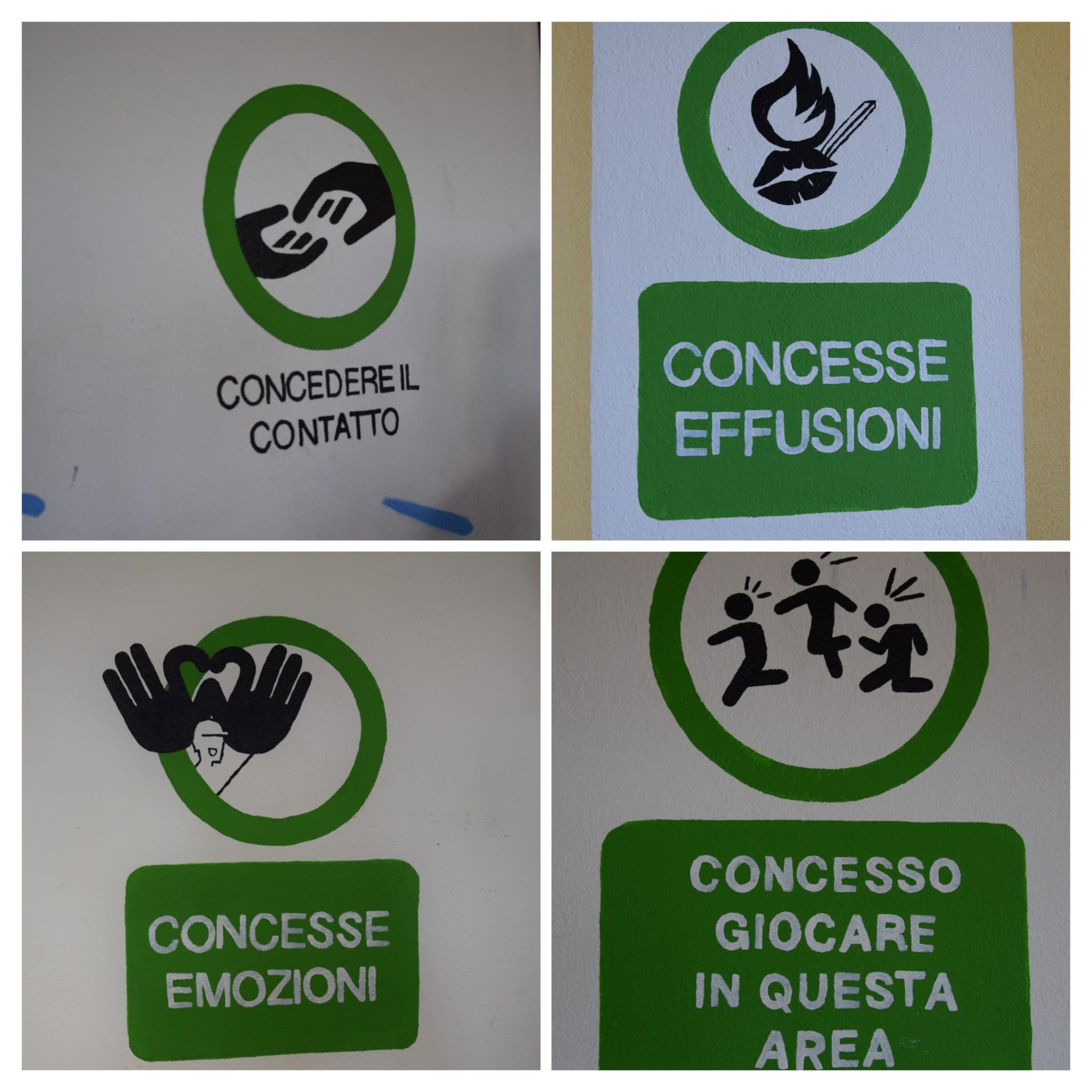 L’intervento di Manu Invisible, curato dal partner Exmè & Affini Onlus, ha sovvertito l’assunto generale per cui tra le mura di un carcere vige la costrizione. Con la tecnica degli stencil ha creato una serie di messaggi che aprono alla concessione: concesse emozioni, concesso giocare in quest’area, concesse effusioni, concesso accarezzarsi, concesso mangiare, concedere il contatto: «Capovolgere il messaggio è l’essenza della street art e questo lavoro è pienamente coerente con ciò che porto avanti ormai da anni», chiarisce l’artista. «L’uso del colore, in questo contesto, diventa una forma di gioia tangibile, un modo per infondere calore e speranza in un ambiente che altrimenti potrebbe risultare opprimente. E questa attenzione minuziosa, questa cura nel creare un luogo accogliente e dignitoso per i più piccoli, è la più pura forma di rispetto verso di loro e verso le loro famiglie, riconoscendo il loro bisogno di normalità e serenità anche in circostanze difficili», sottolinea Ugo Bressanello per Exmé & Affini Onlus.