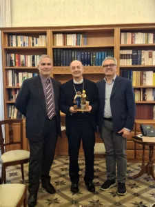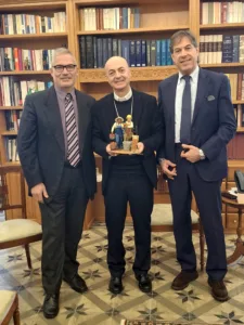 Confartigianato Sud Sardegna e Coldiretti Iglesias Carbonia hanno consegnato al vescovo Mario Farci le statuine di un’imprenditrice agricola e di un imprenditore edile per il presepio 2025