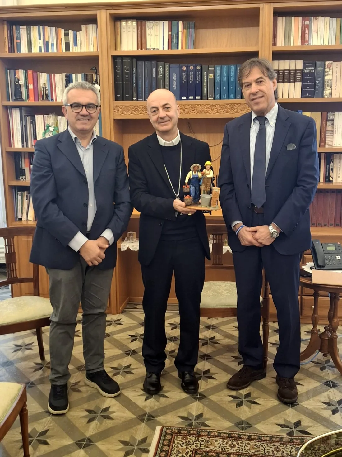 Confartigianato Sud Sardegna e Coldiretti Iglesias Carbonia hanno consegnato al vescovo Mario Farci le statuine di un’imprenditrice agricola e di un imprenditore edile per il presepio 2025