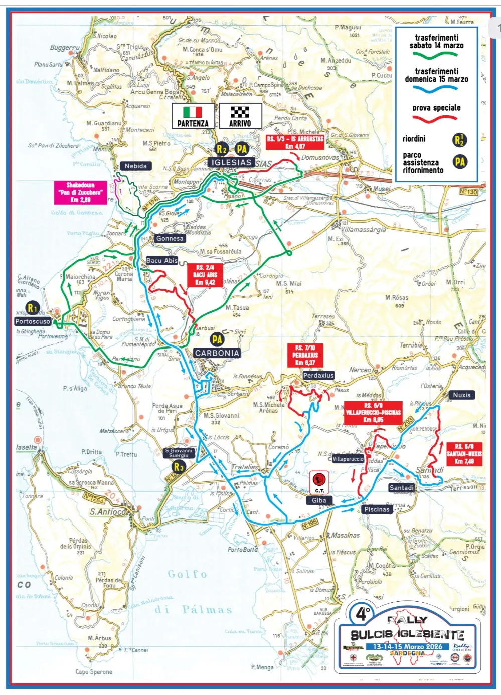 A partire dalle 7.50 di domenica 15 marzo, i concorrenti lasceranno il riordino del Campo Sportivo alla volta del parco assistenza di Carbonia, dove arriveranno dalle 8.25 e sosteranno per 30’. La giornata prevederà tre speciali da ripetere due volte. Si comincerà con la Santadi-Nuxis (7,49 km, ore 9.45 e 13.35), che quest’anno verrà percorsa in senso contrario rispetto alle edizioni precedenti della gara, poi occhi puntati sulla novità del 2026, la Villaperuccio-Piscinas (8,01 km, ore 10.10 e 14), che sarà seguita dal controllo a timbro a Giba, comune assieme a Piscinas una delle new entry di questa edizione. La terza speciale di giornata sarà la Perdaxius (6.33 km, ore 11 e 14.50), stavolta proposta in una versione allungata di altri 900 metri rispetto al passato e diventata, negli anni, un grande classico grazie all’apprezzatissima inversione su sterrato nei pressi del campo sportivo. Dopo il primo passaggio sulle prove della domenica, le vetture faranno rotta verso San Giovanni Suergiu, dove dalle 11.30 ci sarà il riordino e poi si recheranno a Carbonia, in parco assistenza, a partire dalle 12.15. Anche nel secondo giro, inoltre, i concorrenti dovranno compiere un controllo a timbro a Giba dopo la Villaperuccio-Piscinas. Arrivo e cerimonia di premiazione saranno, come da tradizione, in Piazza Sella, a Iglesias, a partire dalle 16.00.