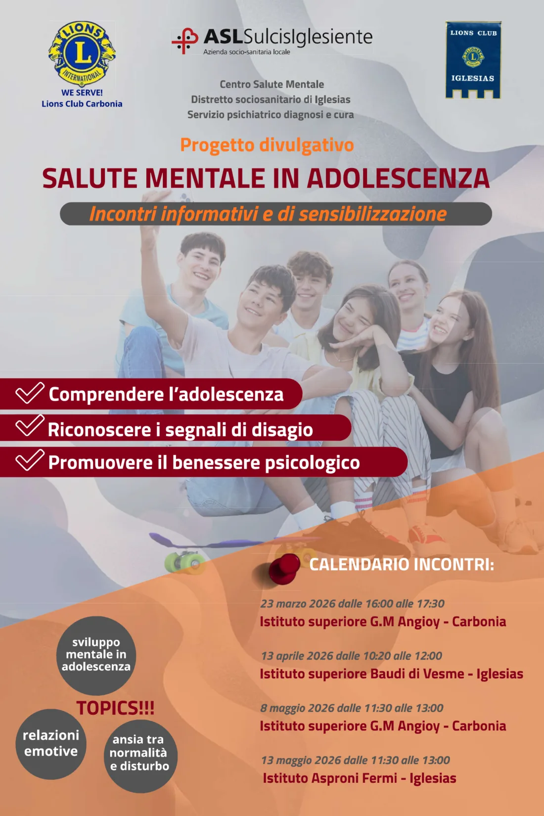 Parlare di salute mentale tra i banchi di scuola per informare, prevenire e ridurre lo stigma. È questo l’obiettivo del ciclo di incontri che prenderà il via il prossimo 23 marzo e che coinvolge alunni degli istituti superiori del territorio, progetto proposto dal Lions Club di Carbonia e dal Lions Club Iglesias ai Servizi per la salute mentale della Asl Sulcis Iglesiente – Centro di Salute Mentale (CSM) e Servizio Psichiatrico di Diagnosi e Cura (SPDC) e al Distretto Socio Sanitario di Iglesias.