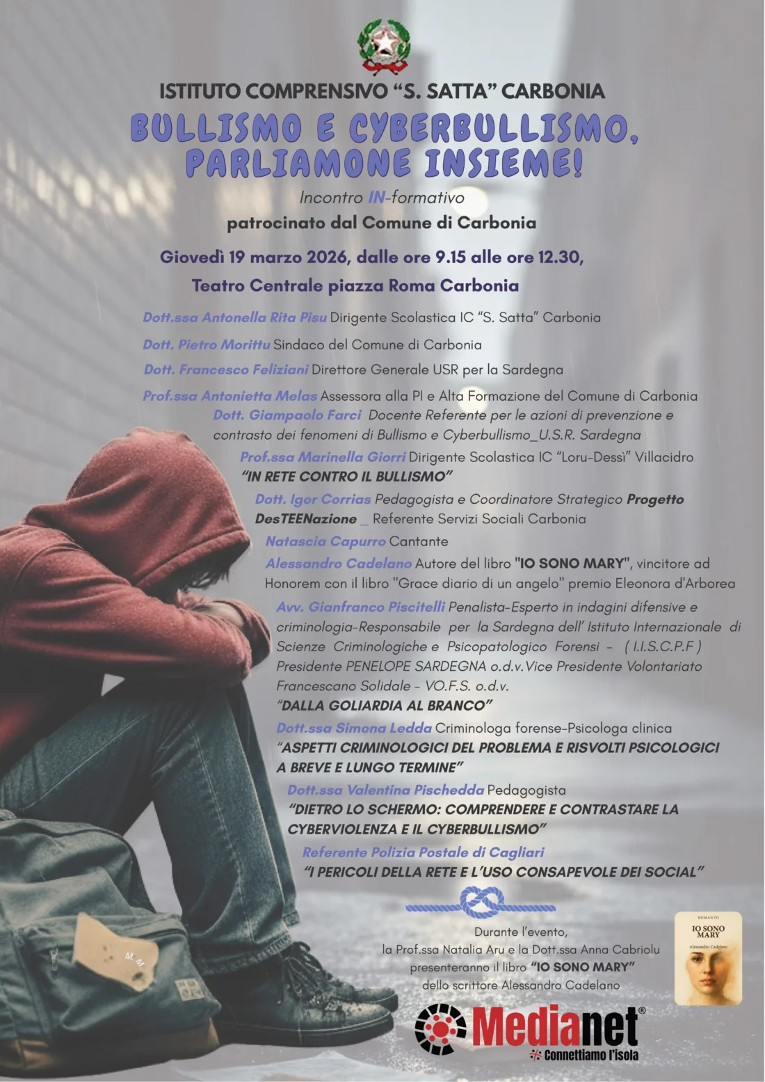 Questo fenomeno rappresenta una problematica in cui, oggi, bambini e ragazzi si trovano a far fronte nei loro contesti di vita quotidiana. Questa forma di violenza viola i diritti all’eguaglianza, alla tolleranza e all’inclusione ed è una responsabilità civile e collettiva. Le vittime vedono compromessa la loro serenità, la loro crescita e la loro salute. È un fenomeno che si caratterizza non solo in contesti sociali difficili, ma interessa sempre più anche gli ambienti scolastici. A tal proposito, sensibile al problema sempre più dilagante, l’istituto Comprensivo “S. Satta” di Carbonia, giovedì 19 marzo, proporrà un incontro IN-formativo presso il Teatro Centrale di Carbonia, dalle 9.15 alle 12.30, “Bullismo e Cyberbullismo parliamone insieme”, con il patrocinio del comune di Carbonia. Aprirà i lavori la dirigente scolastica Antonella Rita Pisu, seguita dal sindaco di Carbonia Pietro Morittu, dall’intervento del dottor Francesco Feliziani, direttore generale USR per la Sardegna, dall’assessora della Pubblica istruzione del comune di Carbonia, professoressa Antonietta Melas. A seguire diversi relatori di notevole importanza come elencato nella locandina dell’evento. Un momento musicale con la cantante Natascia Capurro e, infine, l’intervento della polizia postale di Cagliari. Un evento rivolto alle classi quinte della scuola primaria di primo grado e alla scuola secondaria di primo grado, che avrà sicuramente un impatto importante sui giovani fruitori.