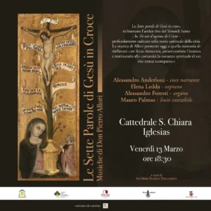 “Le sette parole di Gesù in croce” si rifa all’antico rito del Venerdì Santo delle Tre ore di agonia di Cristo, una tradizione per lungo tempo profondamente radicata nella vita spirituale di Iglesias. Le musiche di don Pietro Allori, composte olte quarant’anni fa e oggi riproposte in una nuova interpretazione, riportano alla luce quella memoria, conservandone il nucleo spirituale e restituendo il senso dell’antico rito. Per secoli, il Venerdì Santo a Iglesias, infatti, è stato segnato dalla celebrazione delle Tre ore d’agonia. Il momento liturgico, costruito sull’alternanza di predicazione, letture evangeliche e canti popolari, aveva al centro la meditazione sulle sette parole pronunciate da Gesù sulla croce. Il rito si articolava in sette sermoni affidati a predicatori invitati per l’occasione, preceduti da un’introduzione e conclusi da una meditazione finale. Le cronache dell’epoca raccontano che la celebrazione non rimaneva confinata alla cattedrale, ma coinvolgeva più ampiamente l’intera comunità cittadina.