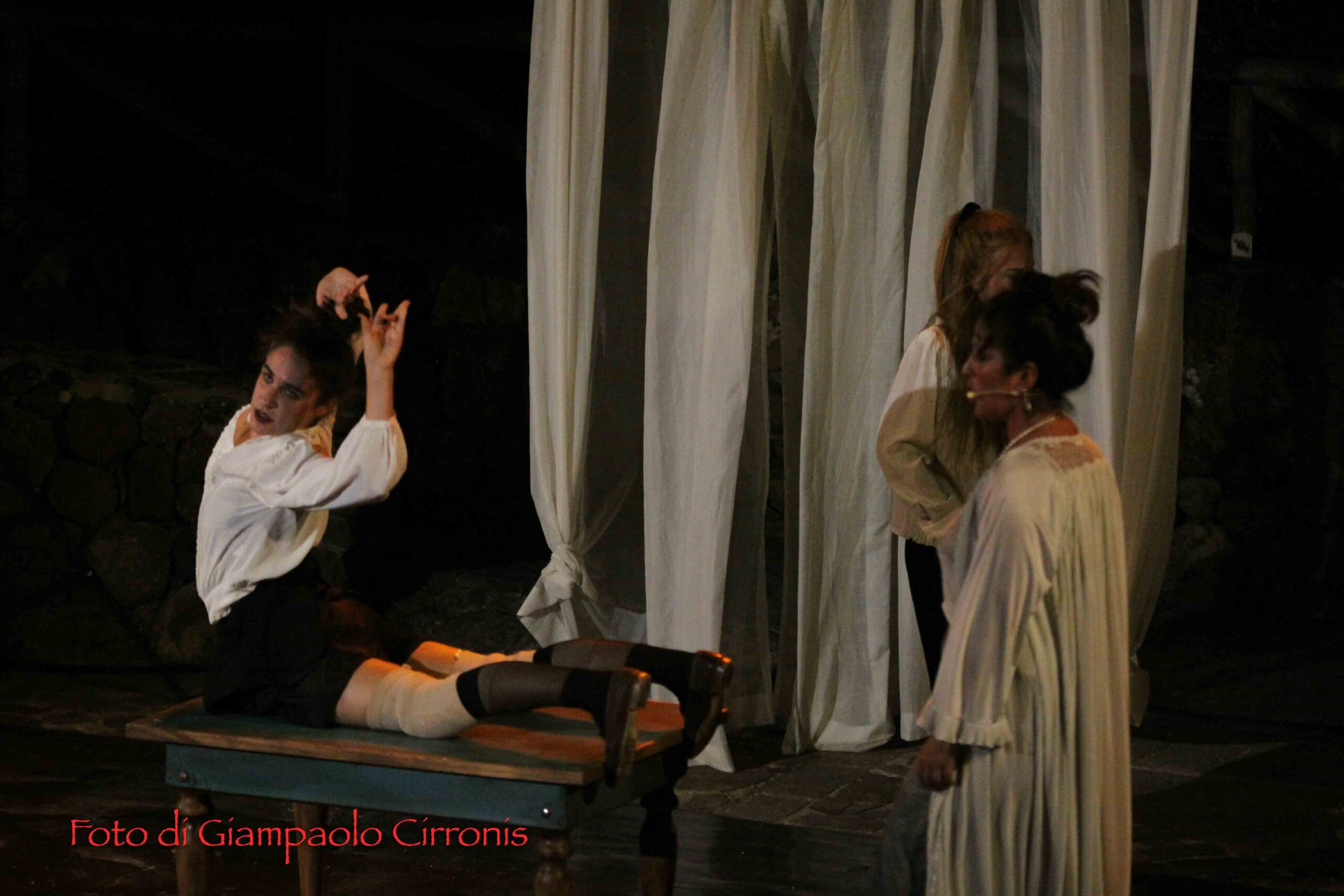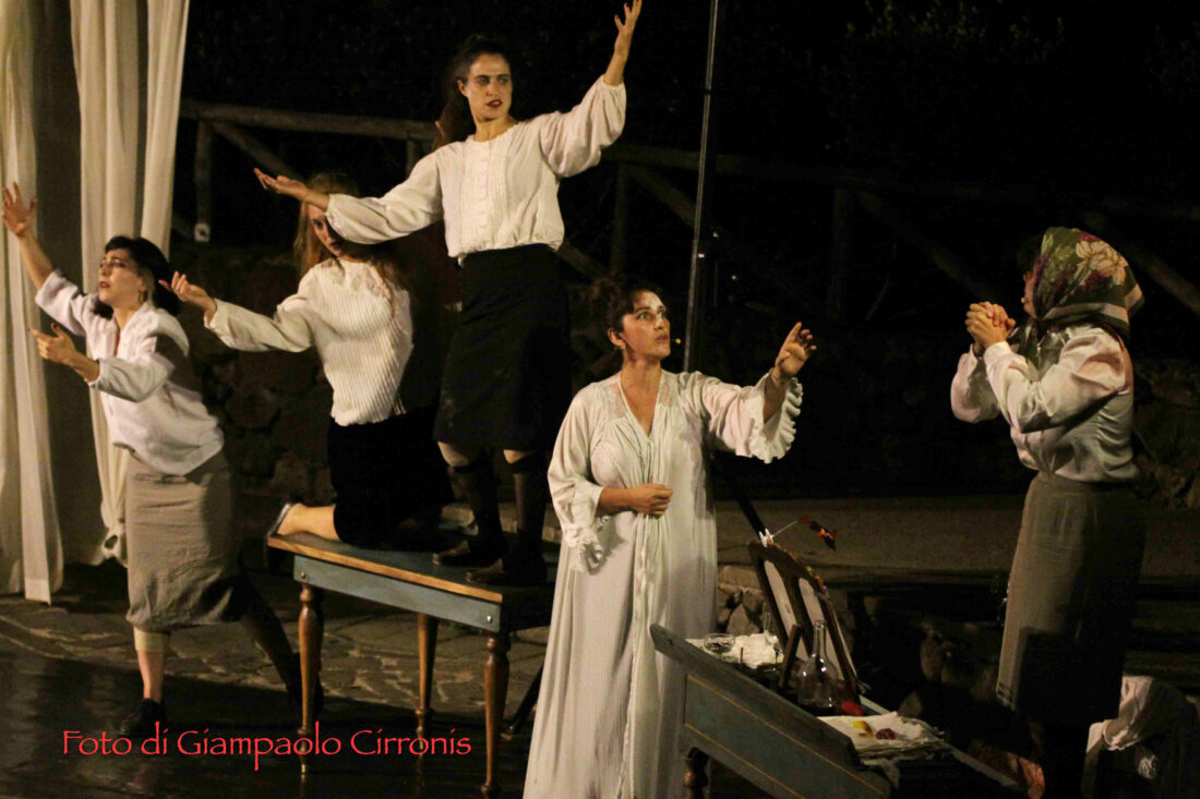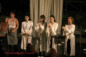 Cinque donne, Simona Ceccobelli, Vinka Delgado, Lupa Maimone, Ayelen Tejedor, Elisa Zedda, hanno messo in scena lo spettacolo Adeus, con la collaborazione alla messa in scena di Florent Bergal. La creazione musicale, anch’essa fondamentale per una buona riuscita della rappresentazione, è opera di Elisa Zedda, Simona Ceccobelli e Lucia Angèle Paglietti. Tra sirene e angeli custodi, tra fazzoletti di stoffa e pettini, ma anche qualche caramella Rossana, i giorni si accorciano, e cinque corpi femminili non vedono l’ora di invecchiare in un luogo polveroso e stantio da riempire di ricordi e di oggetti. È il canovaccio dello spettacolo multidisciplinare prodotto dalla Compagnia Oltrenotte ‘Adeus’, una prospettiva originale sulla vecchiaia, raccontata non come un momento di declino, ma come una fase della vita che le protagoniste attendono con impazienza. Lo spettacolo è una narrazione originale, sul filo dell’ironia, che gioca con le convenzioni sociali e culturali. Un focus sulla vecchiaia, profondamente umano e universale, che ha tenuto alta l’attenzione del pubblico dell’anfiteatro Sirai, anche perché – com’è ben noto – nella nostra Isola dove l’età media della popolazione è in crescita, l’indice di vecchiaia è molto elevato, l’aspettativa di vita è superiore alla media europea. L’Isola e in modo particolare il Sulcis, tra l’altro, hanno un record di centenari.