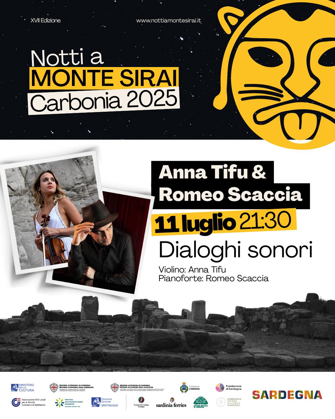 Il festival internazionale ‘Notti a Monte Sirai’ è promosso dal Comune di Carbonia in collaborazione con l’Associazione Enti Locali per le Attività Culturali e di Spettacolo – Festival Multidisciplinare Sardegna, con il sostegno del Ministero della Cultura – Direzione Generale dello Spettacolo, della Fondazione di Sardegna e della Regione Autonoma della Sardegna – Assessorato alla P.I. BB. CC.