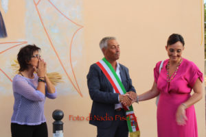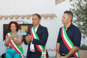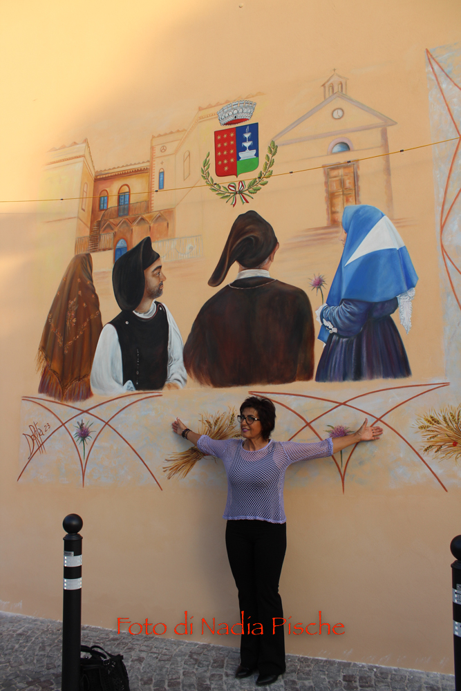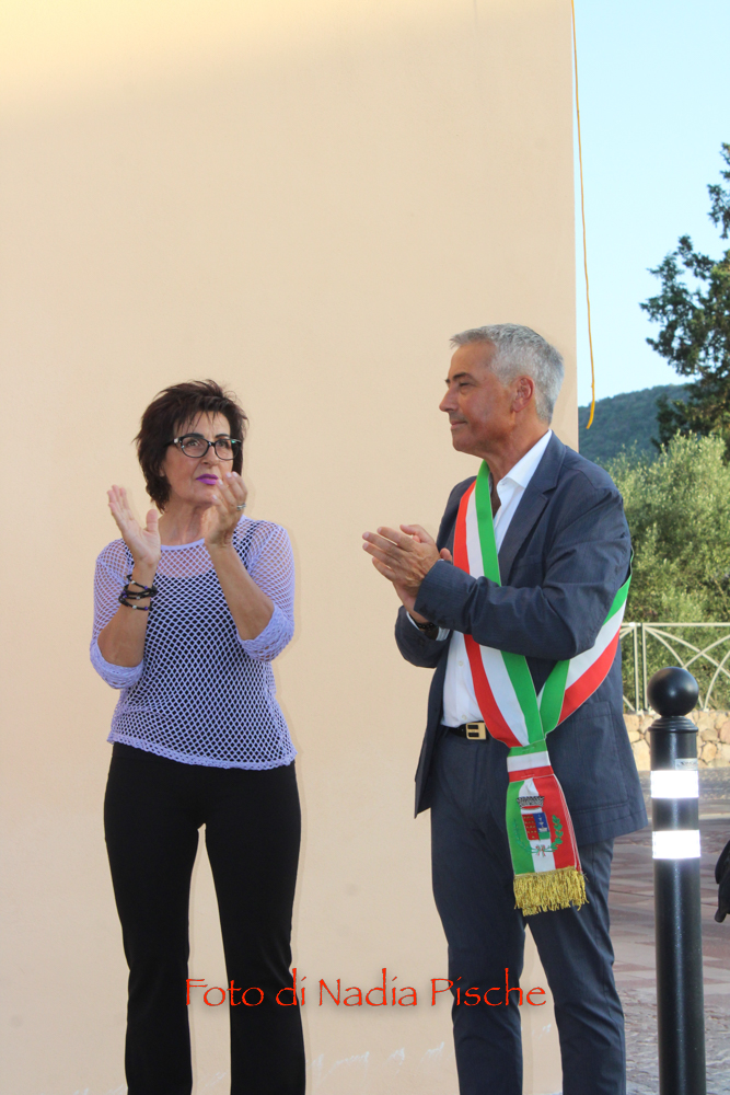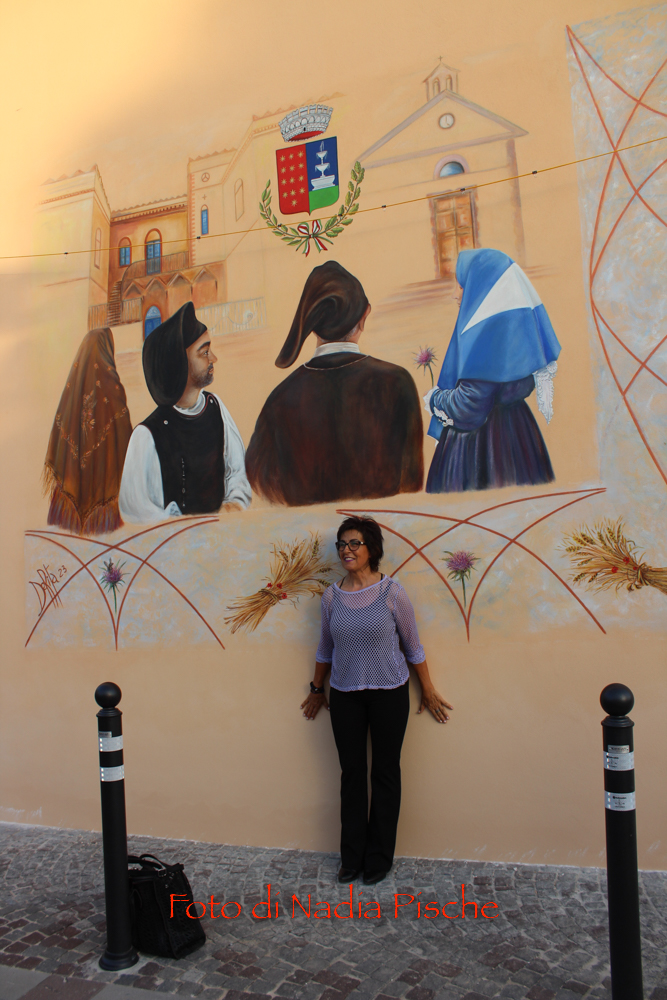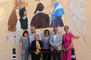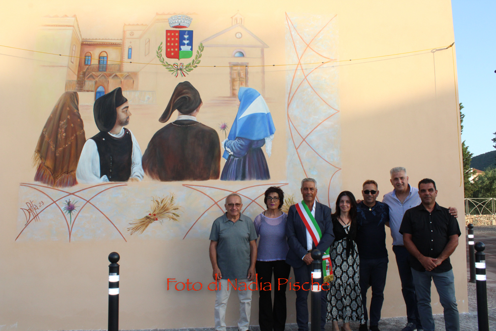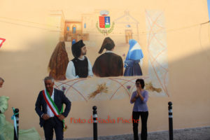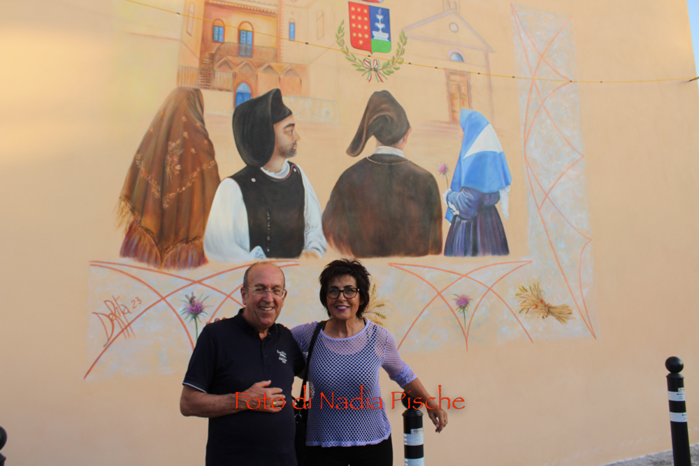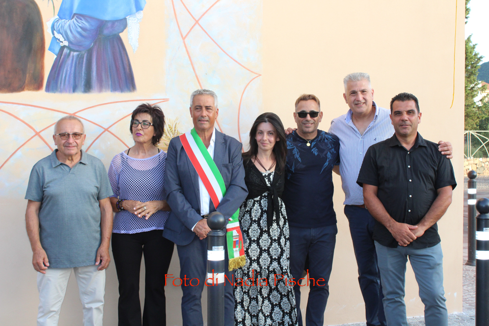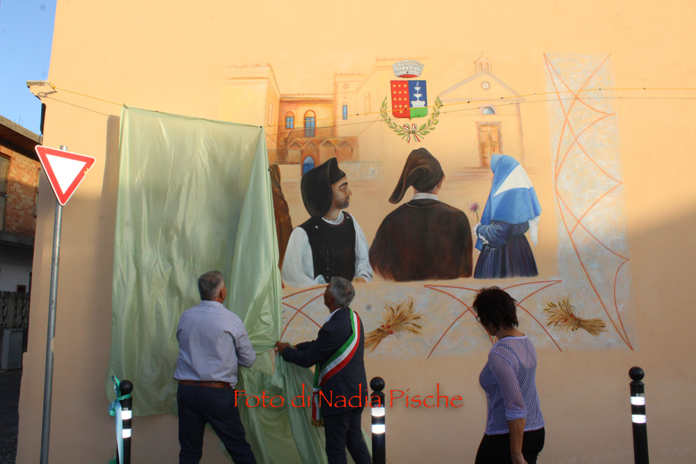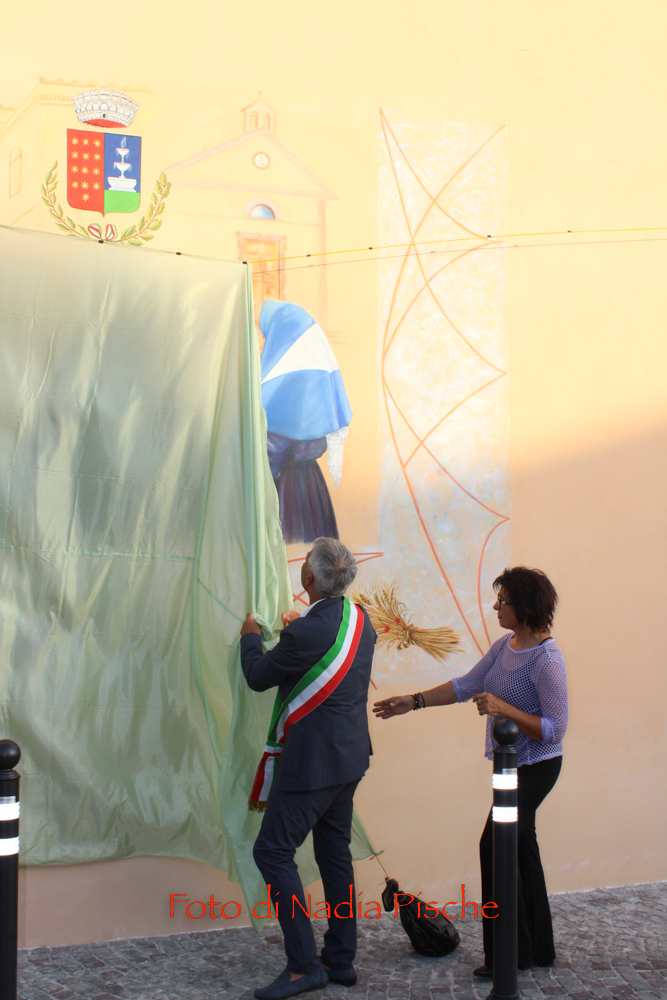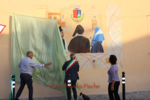 Poco dopo, nella stessa piazza, dopo il taglio eseguito dallo stesso sindaco, con le forbici della scomparsa nonna Maria, l’artista DeRita, visibilmente commossa ha scoperto il murale realizzato su invito del comune di Piscinas. L’opera, come ha spiegato DeRita, vuole essere un omaggio del Comune al paese, ai suoi abitanti…nelle sue tradizioni, simboli, colori e sapori. Unico spunto lo stemma del paese, per il resto l’artista ha avuto carta bianca. Il bozzetto presentato agli amministratori, è stato subito approvato. Il murale riporta lo stemma del Comune al centro, ai due lati, quasi in trasparenza la chiesa e al lato opposto, in bella e particolare prospettiva, Villa Salazar o Villa Bice, edificata alla fine dell’Ottocento dall’architetto Giorgio Asproni, figlio dell’omonimo deputato sardo vissuto nell’Ottocento. Al centro, quattro personaggi simbolo movimentano la scena, rappresentando l’insieme delle tradizioni, usi e costumi, l’anima di una comunità. Alla donna con “Sa mantiglia”, ha sottolineato DeRita, ho voluto affidare la bellezza del cardo mariano o carciofo selvatico, dal bellissimo fiore di colore viola. Per ampliare la superficie del murale, l’artista ha inserito una decorazione a elle, con all’interno una spugnatura di bianco e celeste tenue. L’ispirazione per la realizzazione della cornice è arrivata dalla recinzione moderna della nuova piazzetta che deRita ha colorato utilizzando un color rame intenso. In alcuni spazi della cornice spiccano, oltre al cardo mariano, due mazzi di spighe con papaveri e la firma in bella vista sul lato sinistro. Per arrivare a questo risultato, DeRita ha messo in evidenza le non poche difficoltà incontrate per realizzare l’opera. Un mese di lavoro faticoso, su un ponteggio, il classico che utilizzano i muratori, non idoneo perché attraversato da tubi di ferro che dividevano la parete, e impediva di tracciare liberamente le linee iniziali, su un calpestabile di 45 centimetri e senza la possibilità di verificare la prospettiva a distanza. Il clima torrido, dalle temperature proibitive, infine, ha rallentato ancor di più il lavoro, a causa del sole che “picchiava” duramente per almeno 6/7 ore.