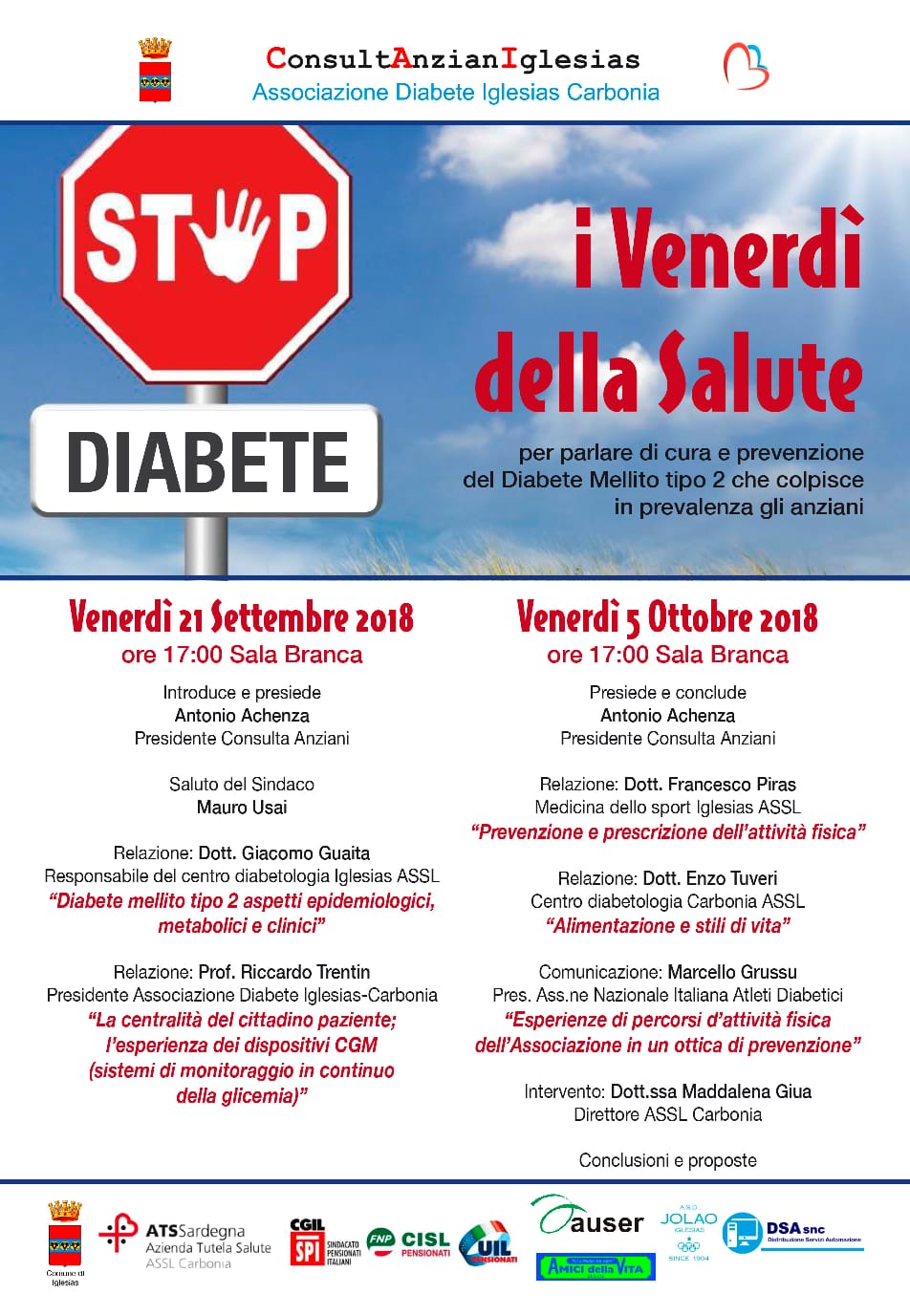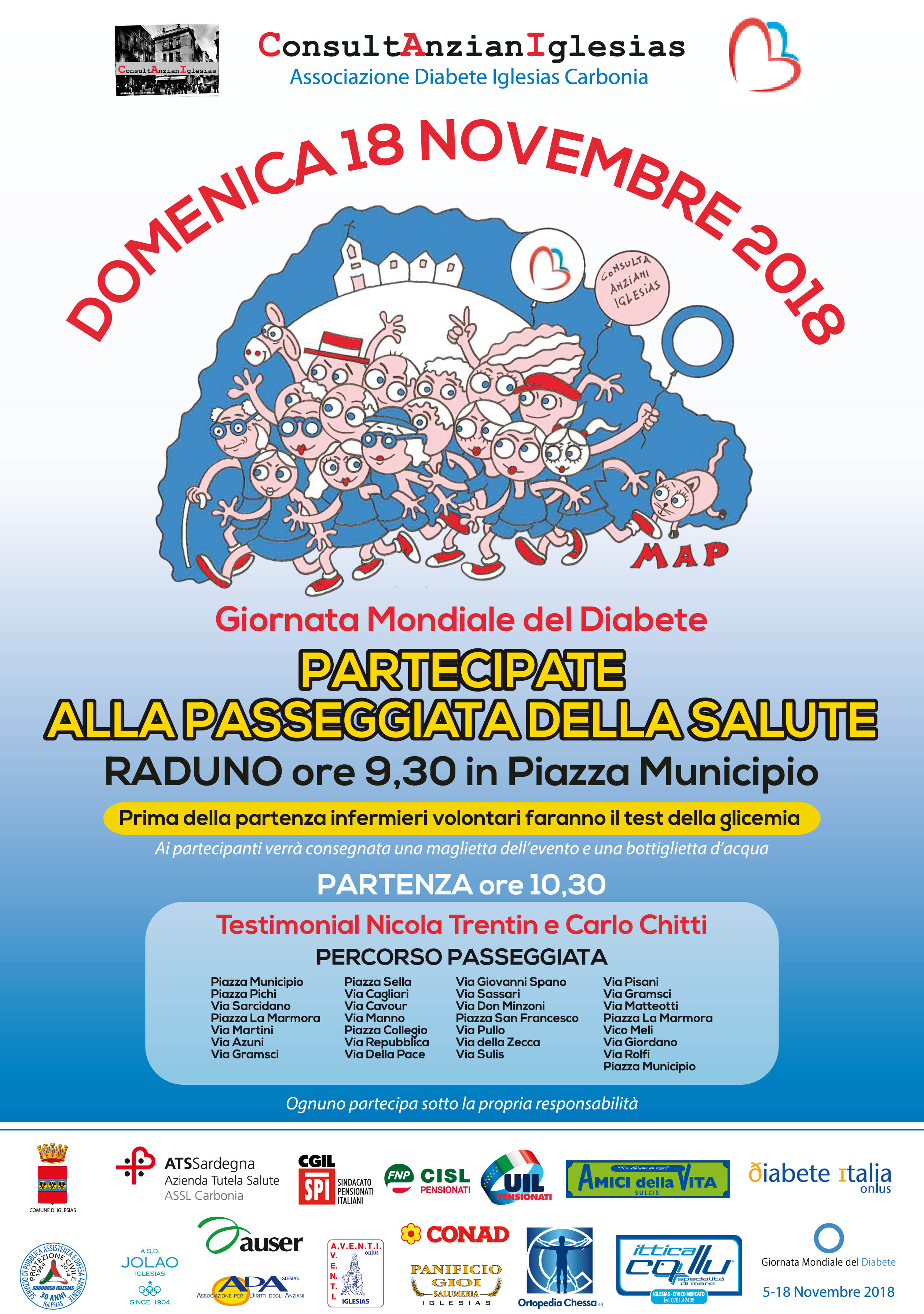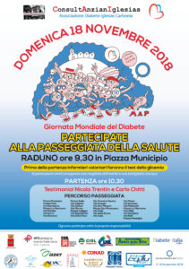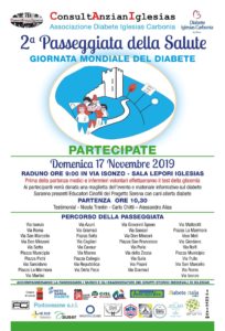 La Consulta Anziani Iglesias e l’Associazione Diabete Iglesias Carbonia hanno organizzato la 2a Passeggiata della Salute che si terrà ad Iglesias nella mattinata di domenica 17 novembre 2019. La manifestazione rientra nelle iniziative della Giornata Mondiale del Diabete. L’evento si propone di sensibilizzare e stimolare, soprattutto le persone anziane, ma non solo, a fare attività fisica per prevenire malattie come il diabete.
