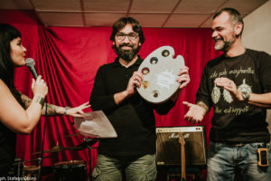 E lo è stato, al di là dei numeri, per la varietà di attrattive del festival: da un lato le birre artigianali con i mastri birrai (i titolari dei quattro brewpub sono stati ringraziati simbolicamente con originali tavolozze con malti e luppoli al posto delle tempere, realizzati a mano da Puddu e Pilleri, vedi foto), dall’altro le opere d’arte realizzate apposta per l’evento da talentuose firme sarde, e poi l’artigianato e l’hobbistica, lo street food e i piatti gourmet.