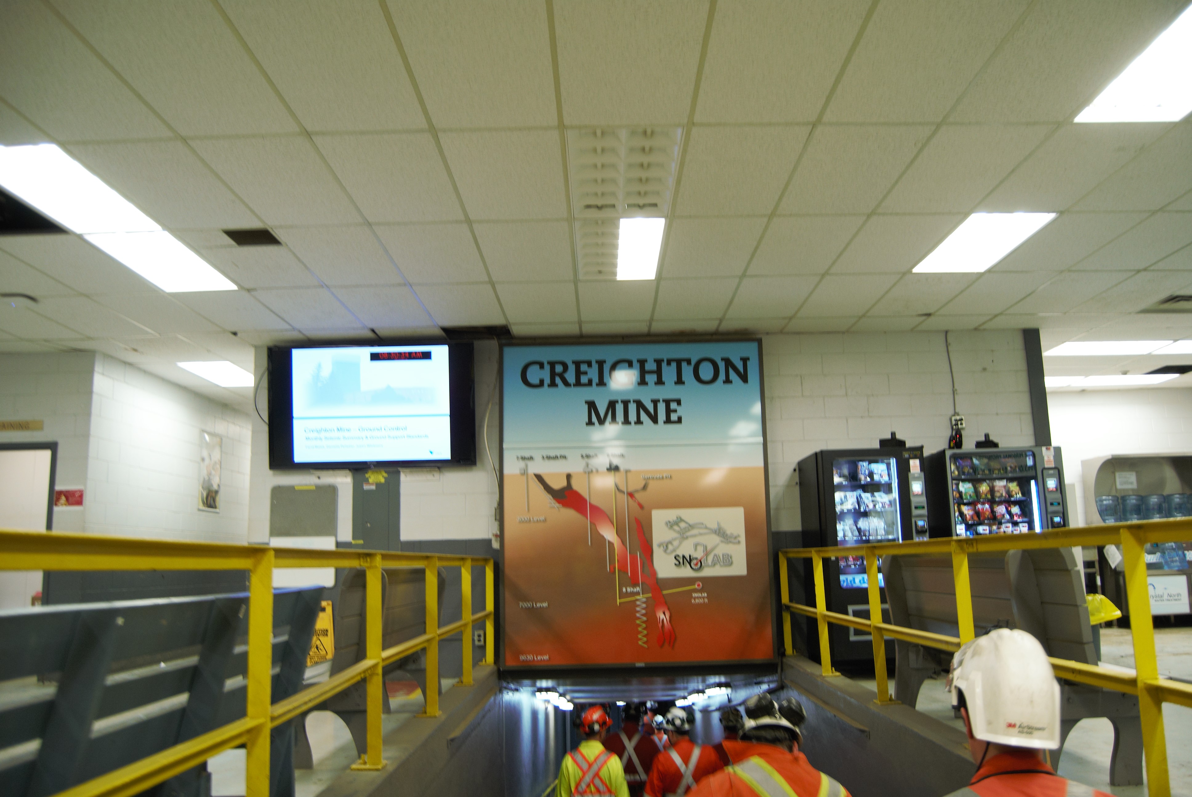 La visita allo SNOLAB ha consentito alla delegazione italiana di verificare le potenzialità di una struttura scientifica all’interno di una miniera in attività. Si tratta di un modello che potrebbe essere replicato anche a Nuraxi Figus dove, oltre al Progetto Aria, si lavora ad altri programmi, sempre nell’ambito della riconversione del sito industriale, con l’obiettivo di trasformare l’ex miniera in un centro di alta tecnologia impegnato in progetti di ricerca. SNOLAB studia prevalentemente la fisica delle astroparticelle, un campo incrociato che esamina le particelle subatomiche da fonti astronomiche. I laboratori sono situati in profondità proprio per proteggere i rivelatori usati negli esperimenti sensibili dalla radiazione cosmica che cade incessantemente sulla superficie della Terra. Anche alla profondità di SNOLAB arrivano raggi cosmici, ma la quantità è 50 milioni di volte inferiore a quella che si avrebbe se l’esperimento fosse localizzato in superficie. La dislocazione unica del laboratorio consente inoltre di avviare progetti e programmi scientifici in diversi campi. Tra questi, in particolare, c’è il progetto DEAP-3600, che vede coinvolti ricercatori di 10 istituzioni in Canada, Regno Unito e Messico. Si tratta di un esperimento che utilizza 3,6 tonnellate di argon liquido per cercare interazioni con particelle di materia oscura.