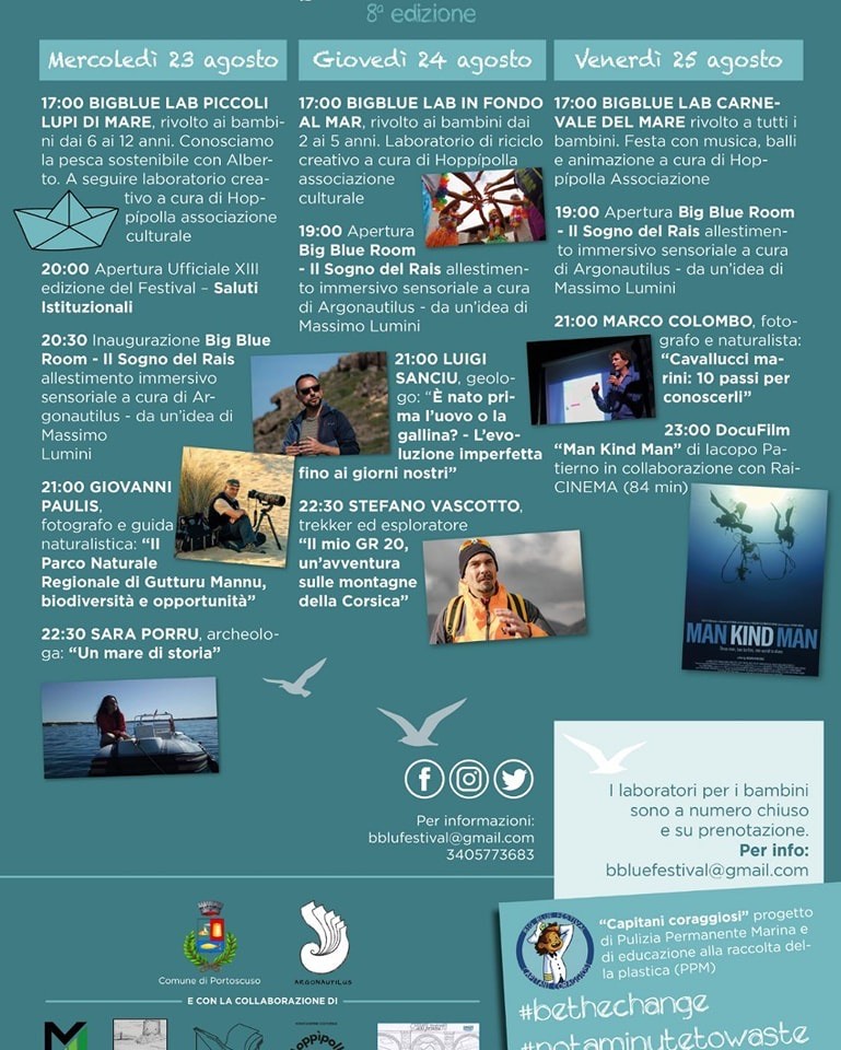 Prende il via domani 28 agosto, alle ore 17.00,  presso l’Antica Tonnara Su Pranu di Portoscuso, la V edizione del Big Blue Festival. Tre giorni (28-29-30 agosto) dedicati al mare, all’ambiente, alla natura e alla sostenibilità.